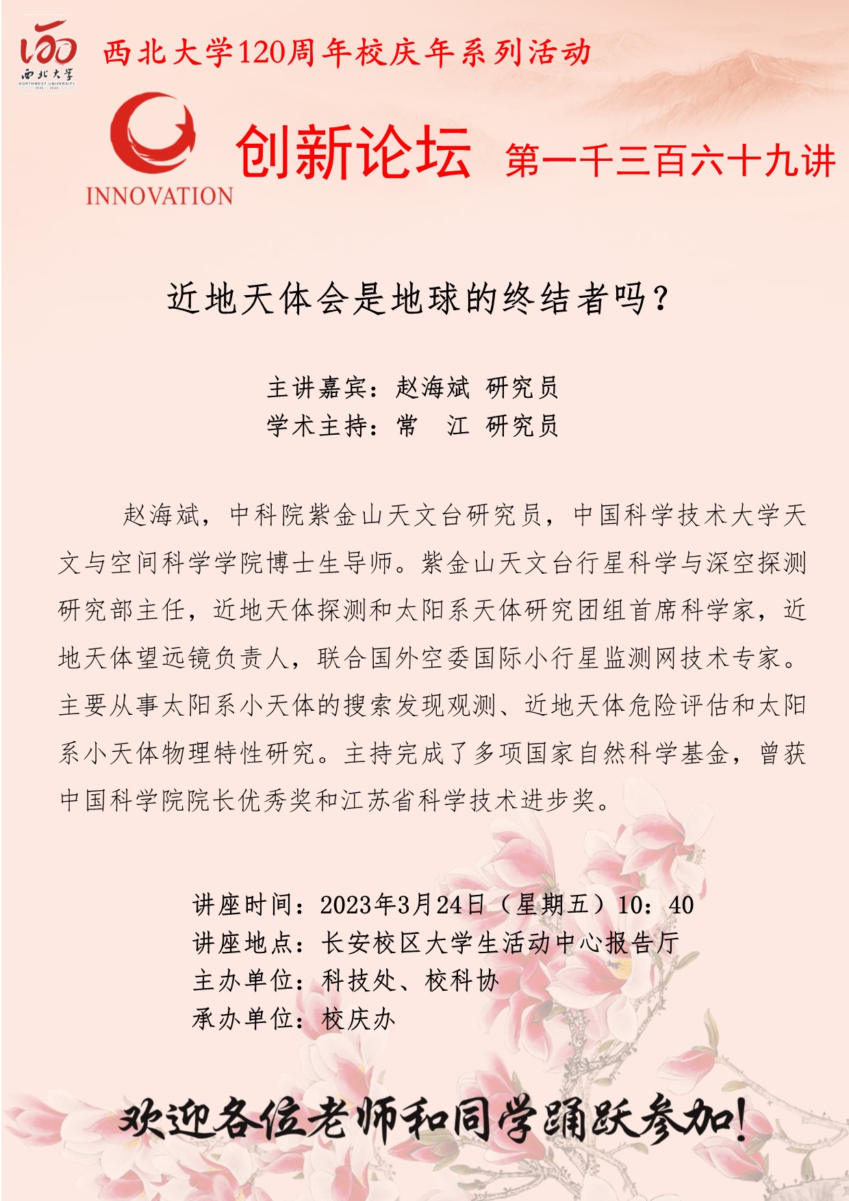 赵海斌 研究员 九游会在线登录官网创新论坛第一千三百六十九讲暨120周年校庆年系列活动:近地天体会是地球的终结者吗? 讲座时间 2023年3月24日(星期五)10:40 讲座地点 长安校区大学生活动中心报告厅 讲座人介绍 赵海斌 研究员 讲座内容