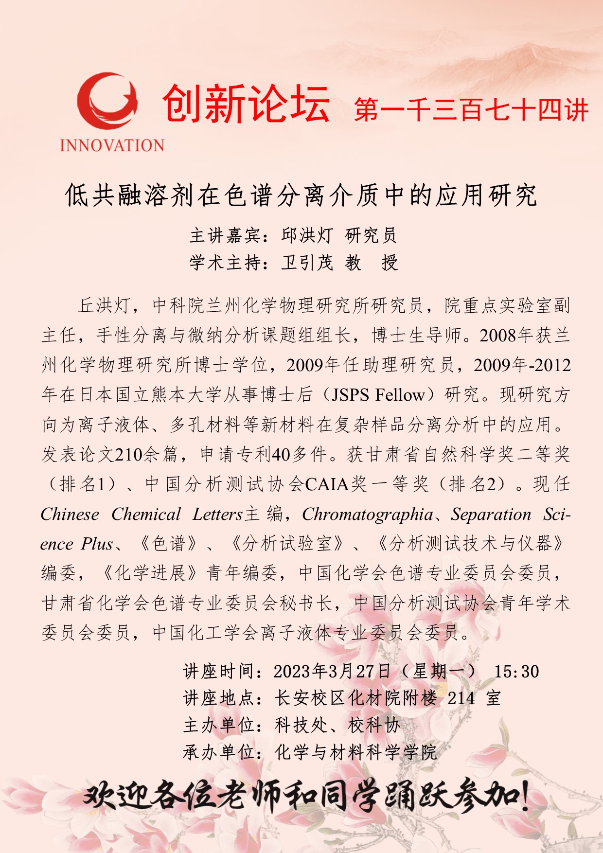 邱洪灯 研究员 九游会在线登录官网创新论坛第一千三百七十四讲:低共融溶剂在色谱分离介质中的应用研究 讲座时间 2023年3月27日(星期一) 15:30 讲座地点 长安校区化材院附楼214室 讲座人介绍 邱洪灯 研究员 讲座内容