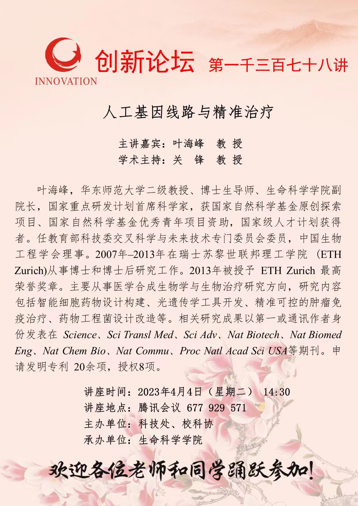 叶海峰 教授 九游会在线登录官网创新论坛第一千三百七十八讲:人工基因线路与精准治疗 讲座时间 2023年4月4日(星期二) 14:30 讲座地点 腾讯会议 677 929 571 讲座人介绍 叶海峰 教授 讲座内容