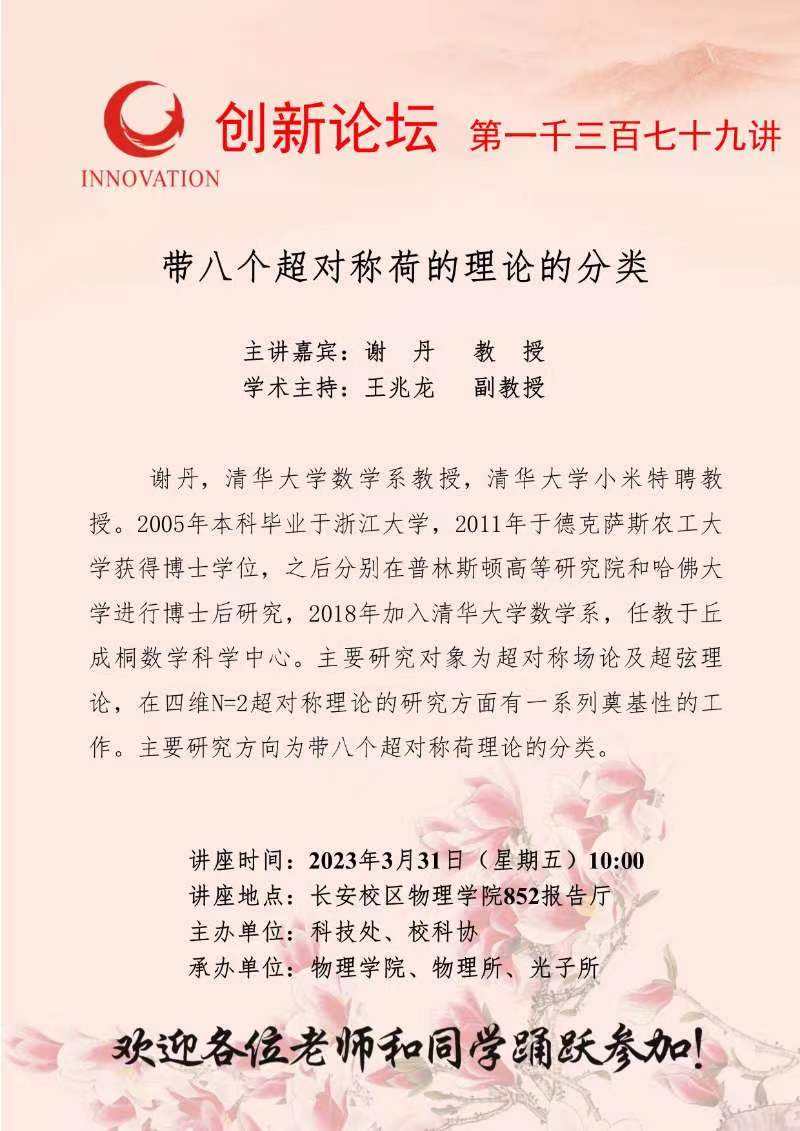 谢丹 教授 九游会在线登录官网创新论坛第一千三百七十九讲:带八个超对称荷的理论的分类 讲座时间 2023年3月31日(星期五)10:00 讲座地点 长安校区物理学院852报告厅 讲座人介绍 谢丹 教授 讲座内容