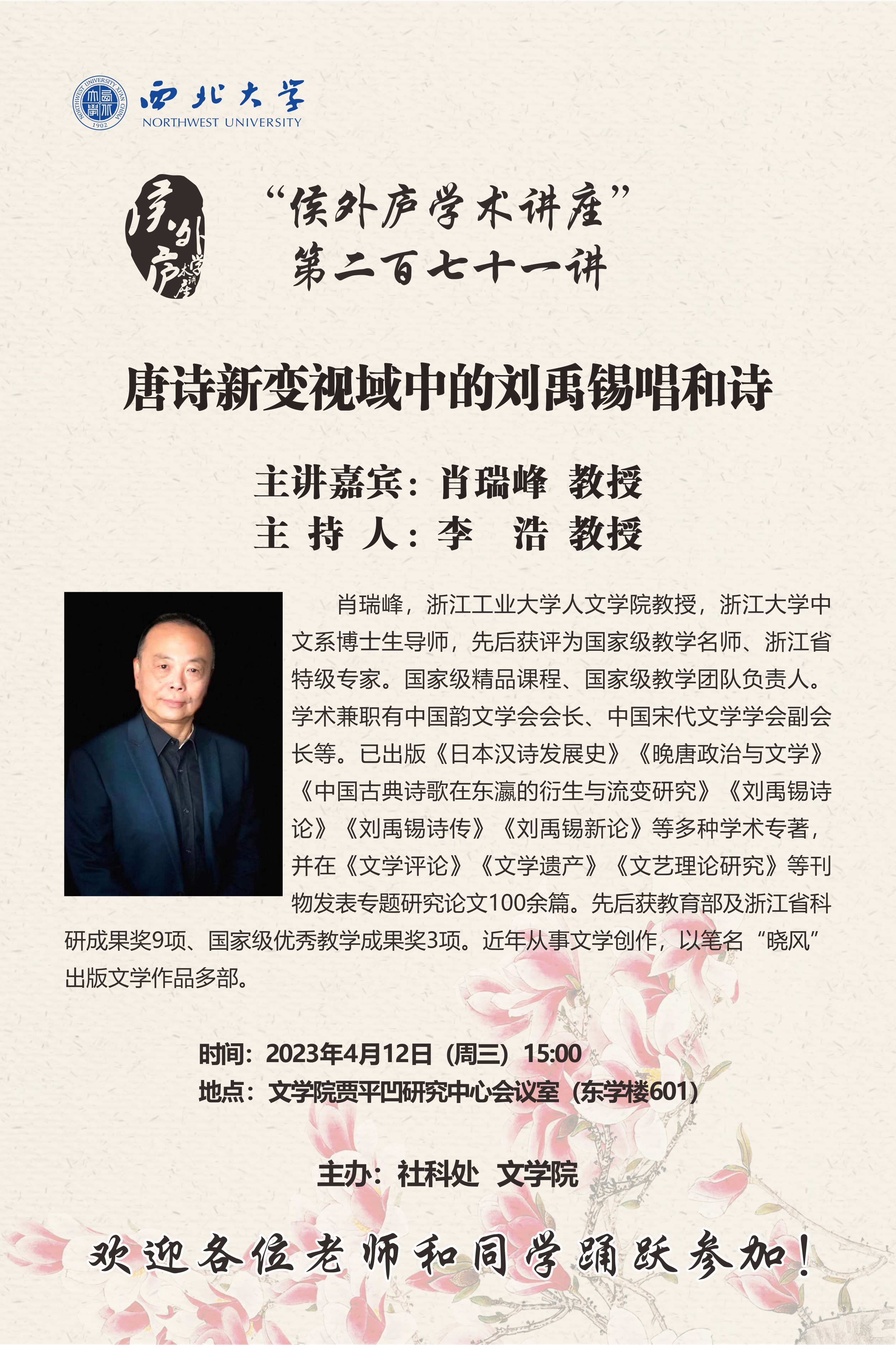 肖瑞峰 教授 侯外庐学术讲座第二百七十一讲:唐诗新变视域中的刘禹锡唱和诗 讲座时间 2023年4月12日(周三)15:00 讲座地点 文学院贾平凹研究中心会议室(东学楼601) 讲座人介绍 肖瑞峰 教授 讲座内容