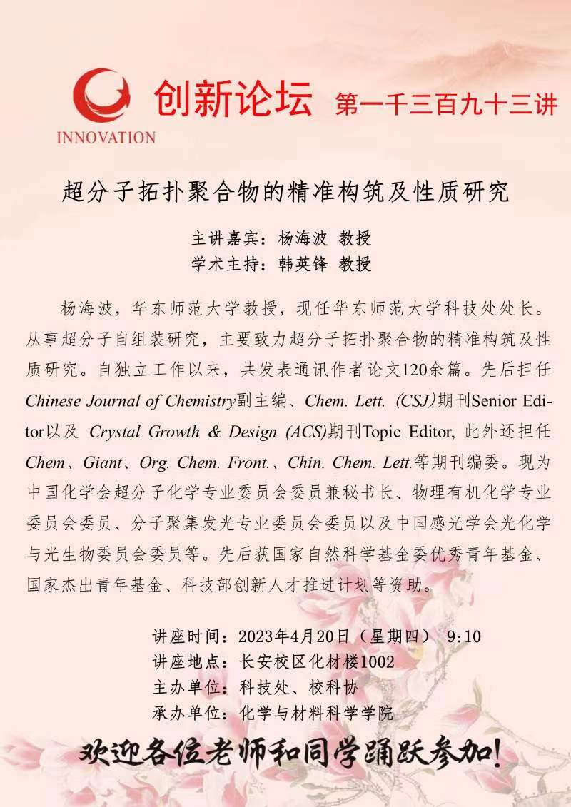 杨海波 教授 九游会在线登录官网创新论坛第一千三百九十三讲:超分子拓扑聚合物的精准构筑及性质研究 讲座时间 2023年4月20日(星期四) 9:10 讲座地点 长安校区化材楼1002 讲座人介绍 杨海波 教授 讲座内容