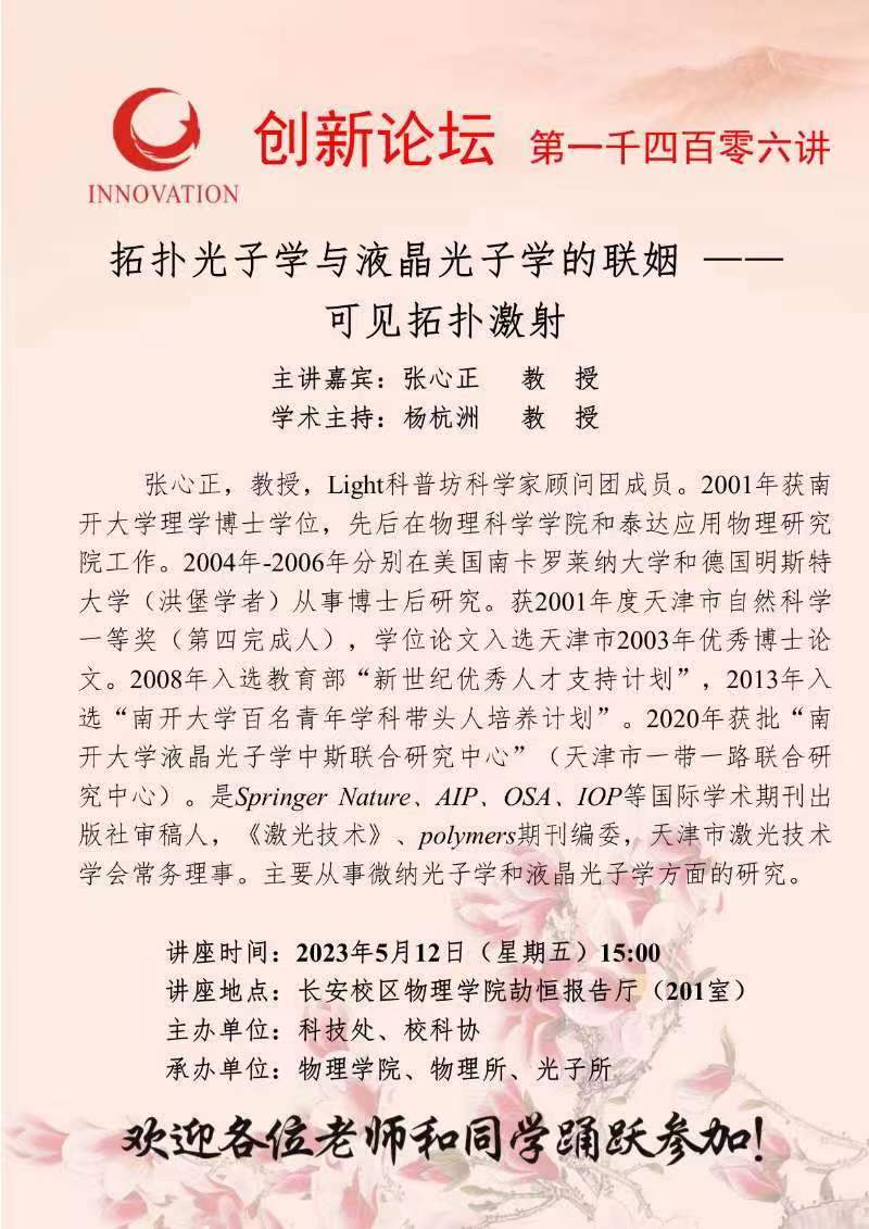 张心正 教 授 九游会在线登录官网创新论坛第一千四百零六讲:拓扑光子学与液晶光子学的联姻 — 可见拓扑激射 讲座时间 2023年5月12日(星期五)15:00 讲座地点 长安校区物理学院劼恒报告厅(201室) 讲座人介绍 张心正 教 授 讲座内容