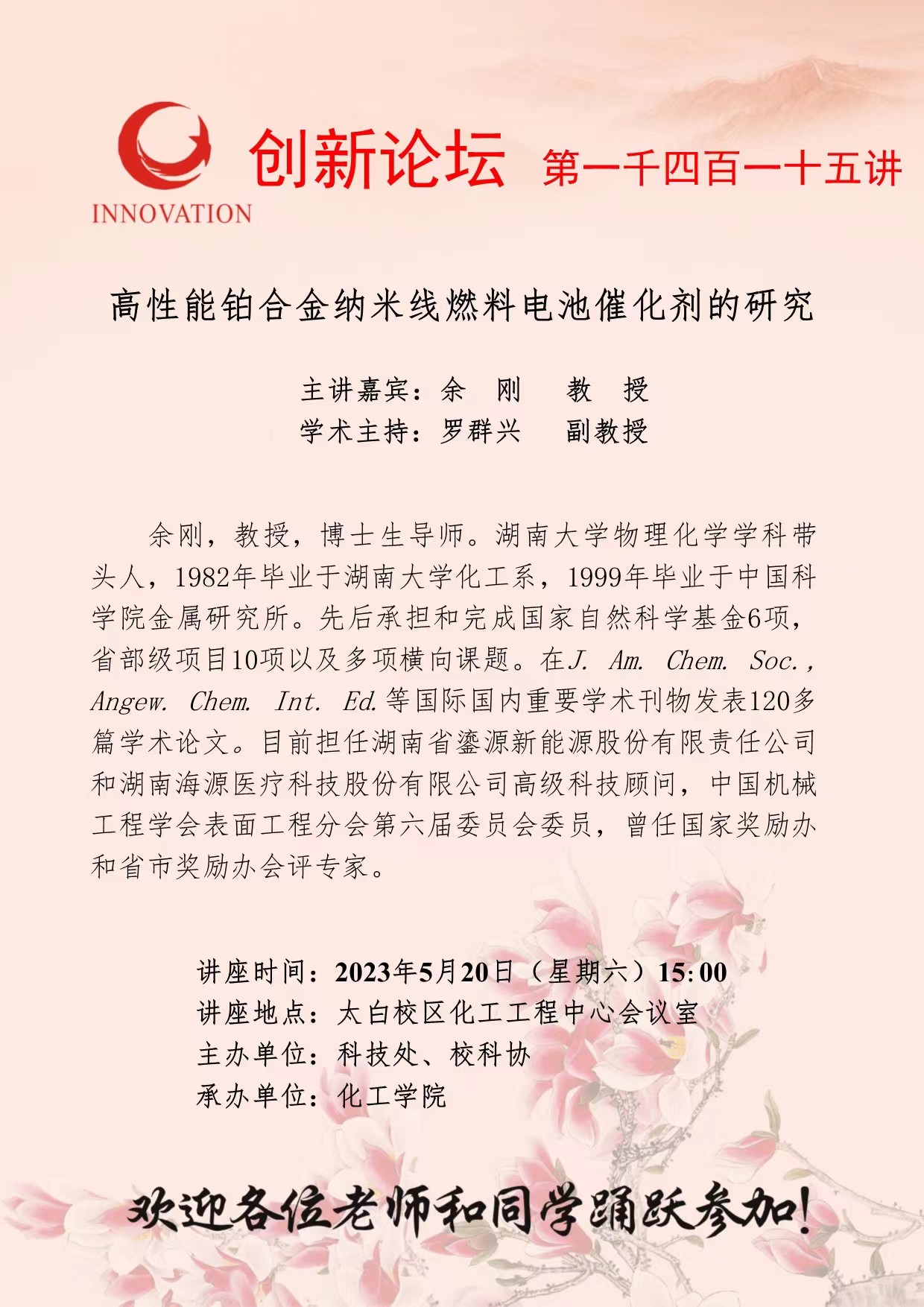 余 刚 教 授 九游会在线登录官网创新论坛第一千四百一十五讲:高性能铂合金纳米线燃料电池催化剂的研究 讲座时间 2023年5月20日(星期六)15:00 讲座地点 太白校区化工工程中心会议室 讲座人介绍 余 刚 教 授 讲座内容