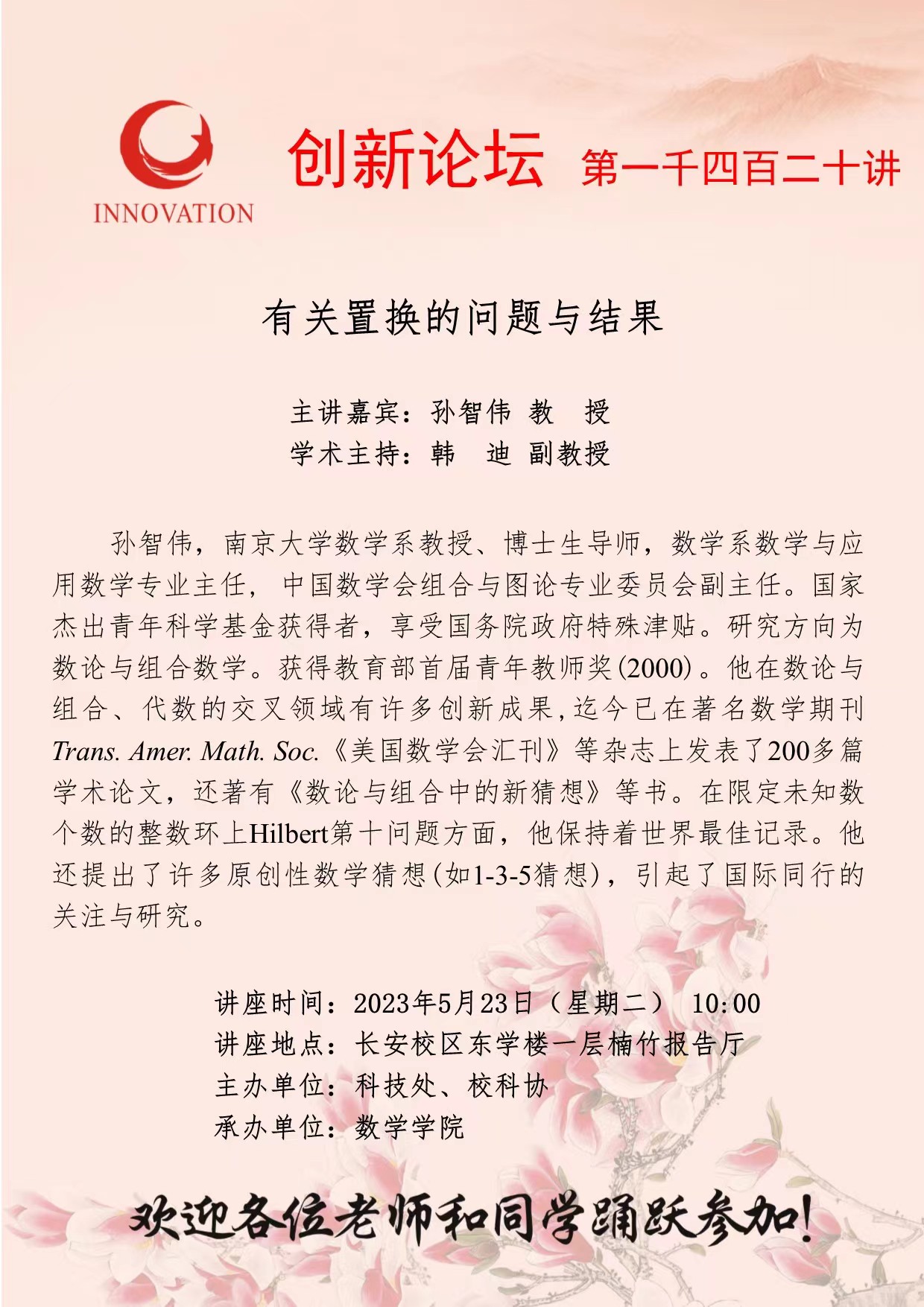 孙智伟 教 授 九游会在线登录官网创新论坛第一千四百二十讲:有关置换的问题与结果 讲座时间 2023年5月23日(星期二) 10:00 讲座地点 长安校区东学楼一层楠竹报告厅 讲座人介绍 孙智伟 教 授 讲座内容
