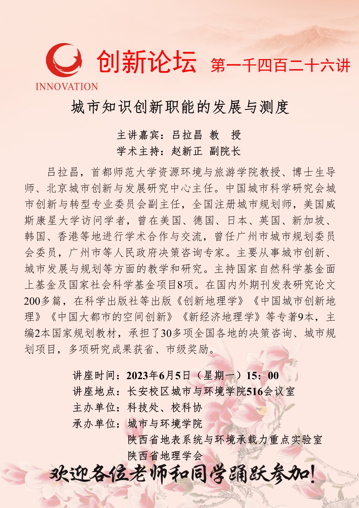吕拉昌 教授 九游会在线登录官网创新论坛第一千四百二十六讲:城市知识创新职能的发展与测度 讲座时间 2023年6月5日(星期一)15:00 讲座地点 长安校区城市与环境学院516会议室 讲座人介绍 吕拉昌 教授 讲座内容