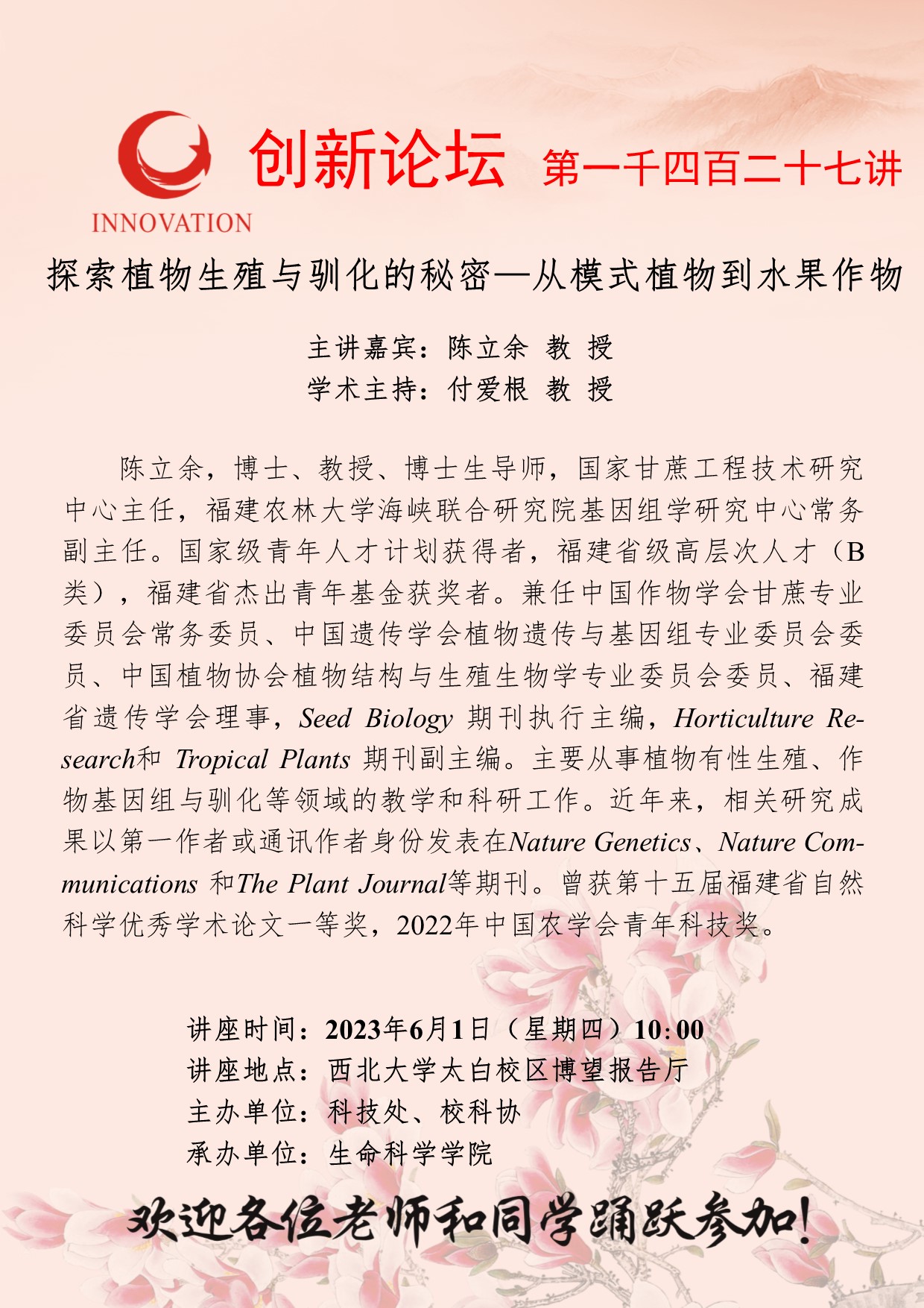 陈立余 教授 九游会在线登录官网创新论坛第一千四百二十七讲:探索植物生殖与驯化的秘密—从模式植物到水果作物 讲座时间 2023年6月1日(星期四)10:00 讲座地点 九游会在线登录官网太白校区博望报告厅 讲座人介绍 陈立余 教授 讲座内容