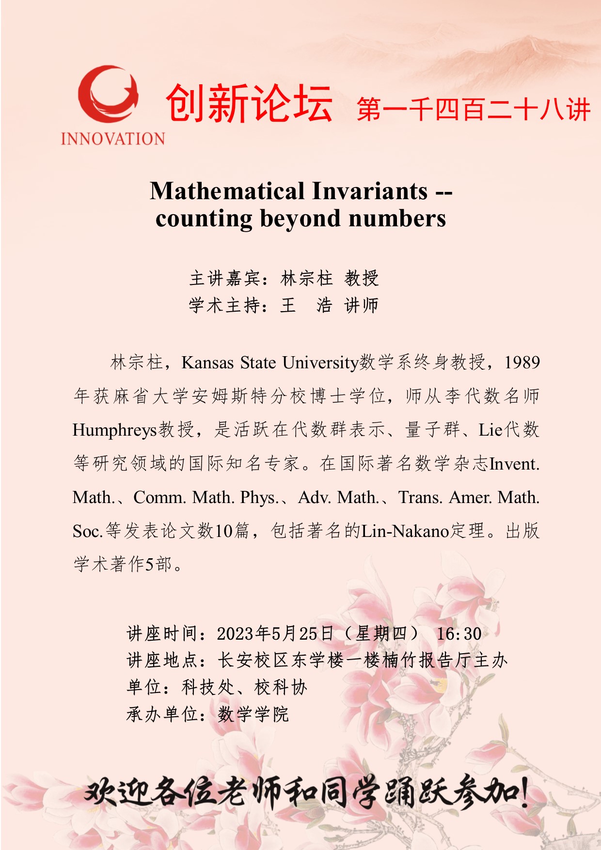 林宗柱 教授 九游会在线登录官网创新论坛第一千四百二十八讲:Mathematical Invariants --counting beyond numbers 讲座时间 2023年5月25日(星期四)16:30 讲座地点 长安校区东学楼一楼楠竹报告厅 讲座人介绍 林宗柱 教授 讲座内容