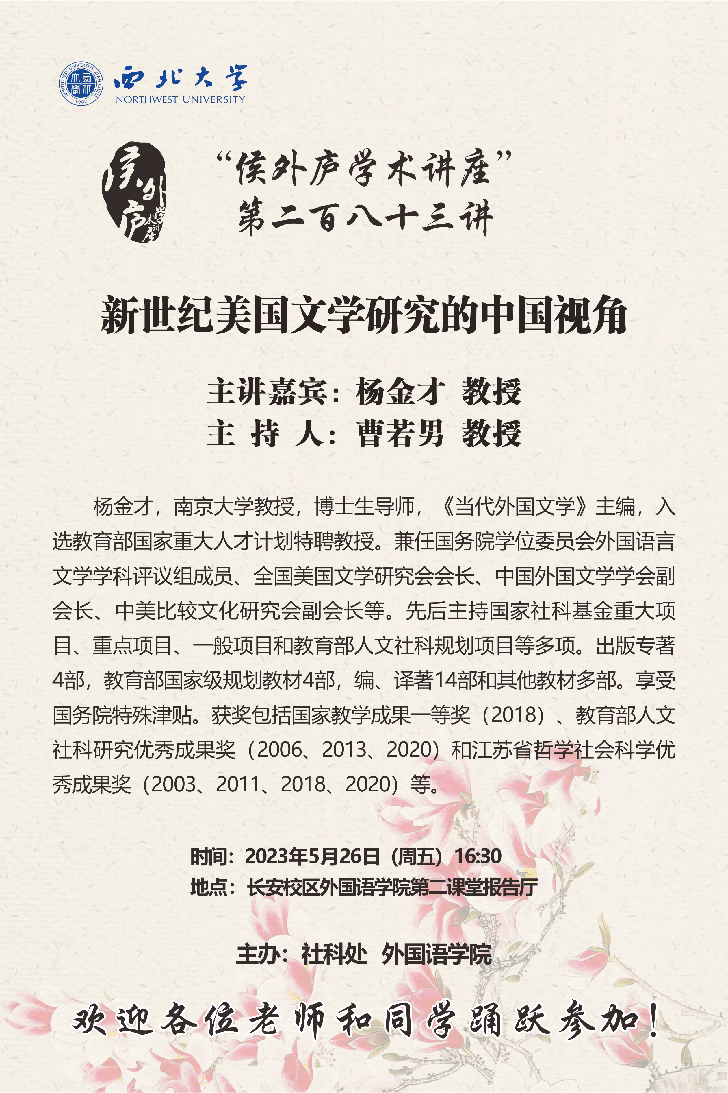 杨金才 教授 侯外庐学术讲座第二百八十三讲:新世纪美国文学研究的中国视角 讲座时间 2023年5月26日(周五)16:30 讲座地点 长安校区外国语学院第二课堂报告厅 讲座人介绍 杨金才 教授 讲座内容