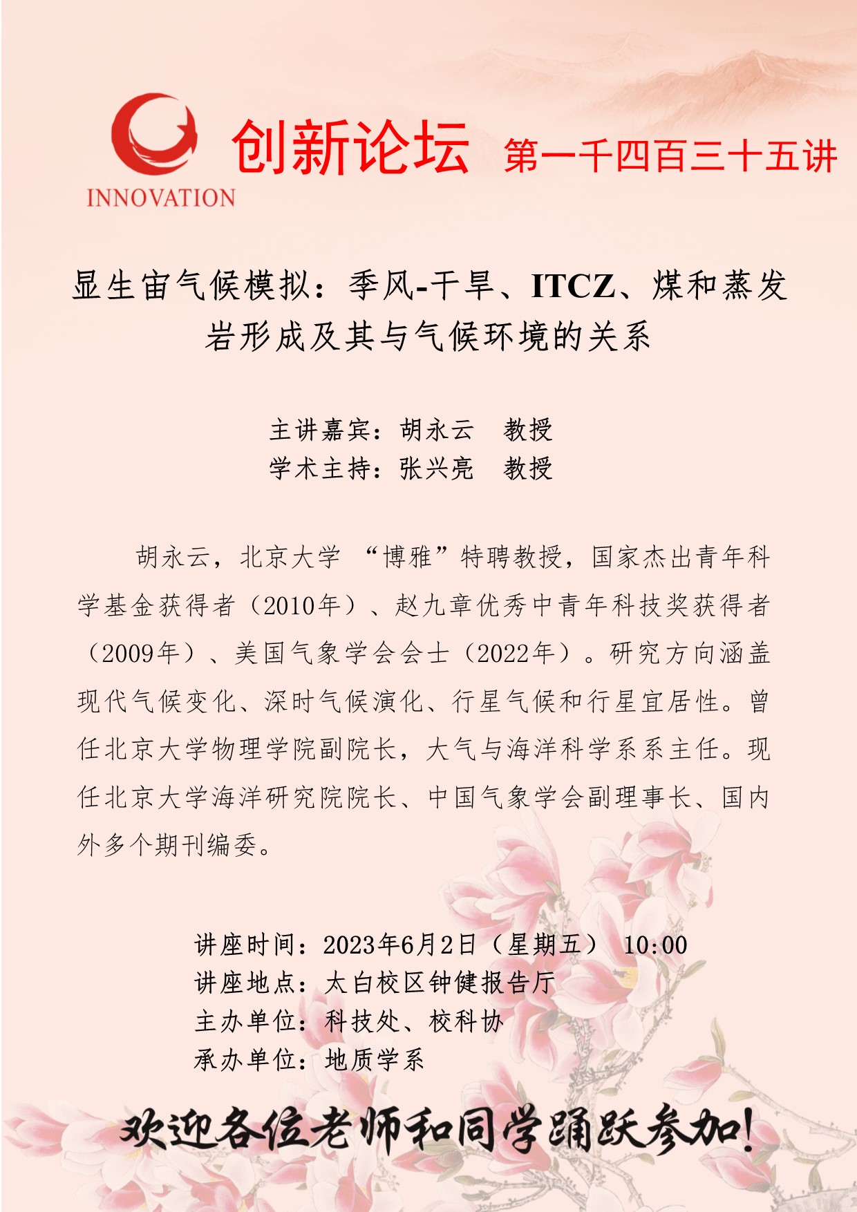 胡永云 教授 九游会在线登录官网创新论坛第一千四百三十五讲:显生宙气候模拟:季风-干旱、ITCZ、煤和蒸发岩形成及其与气候环境的关系 讲座时间 2023年6月2日(星期五) 10:00 讲座地点 太白校区钟健报告厅 讲座人介绍 胡永云 教授 讲座内容