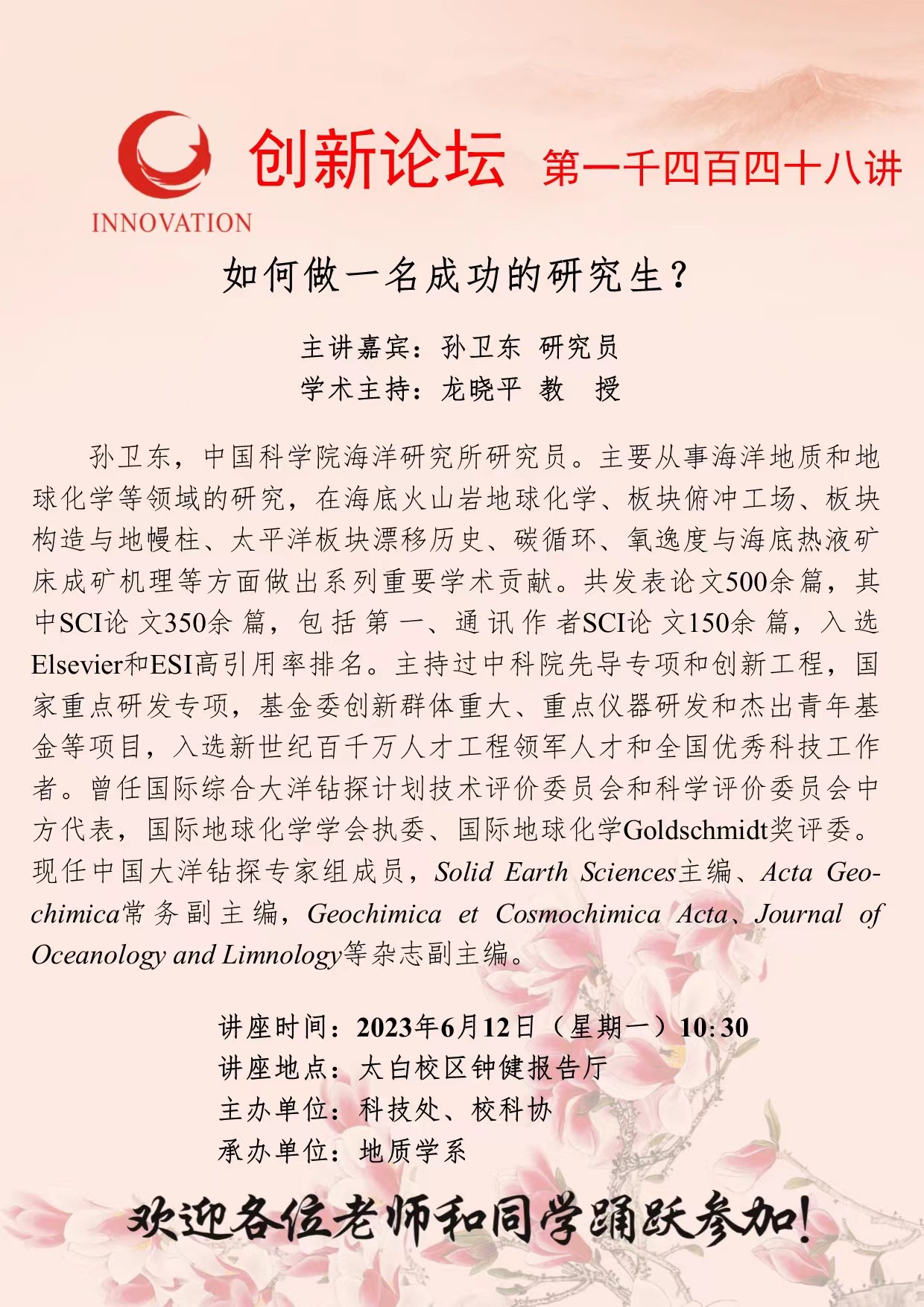 孙卫东 教 授 九游会在线登录官网创新论坛第一千四百四十八讲:如何做一名成功的研究生? 讲座时间 2023年6月12日(星期一)10:30 讲座地点 太白校区钟健报告厅 讲座人介绍 孙卫东 教 授 讲座内容