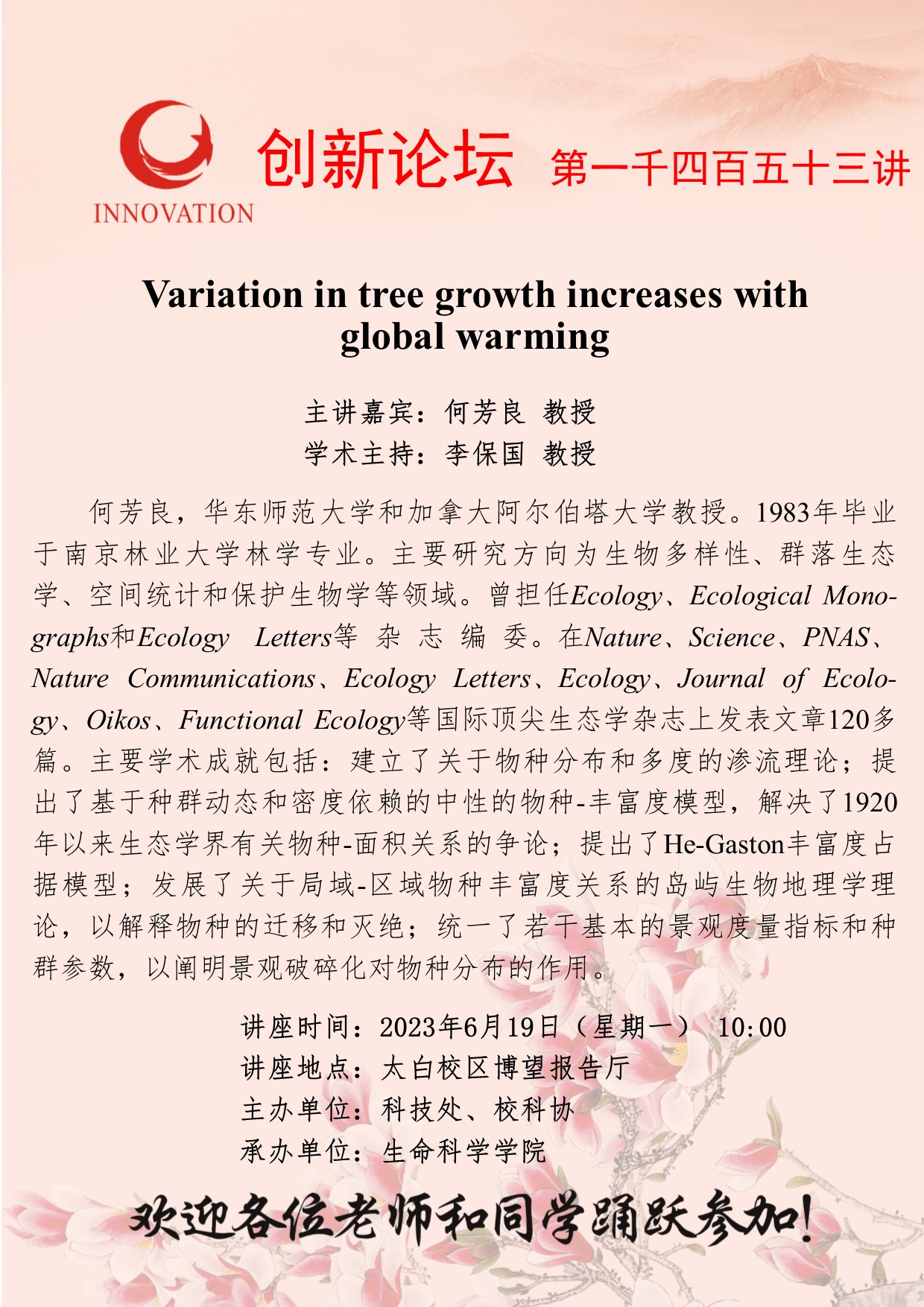 何芳良 教授 九游会在线登录官网创新论坛第一千四百五十三讲:Variation in tree growth increases with global warming 讲座时间 2023年6月19日(星期一) 10:00 讲座地点 太白校区博望报告厅 讲座人介绍 何芳良 教授 讲座内容