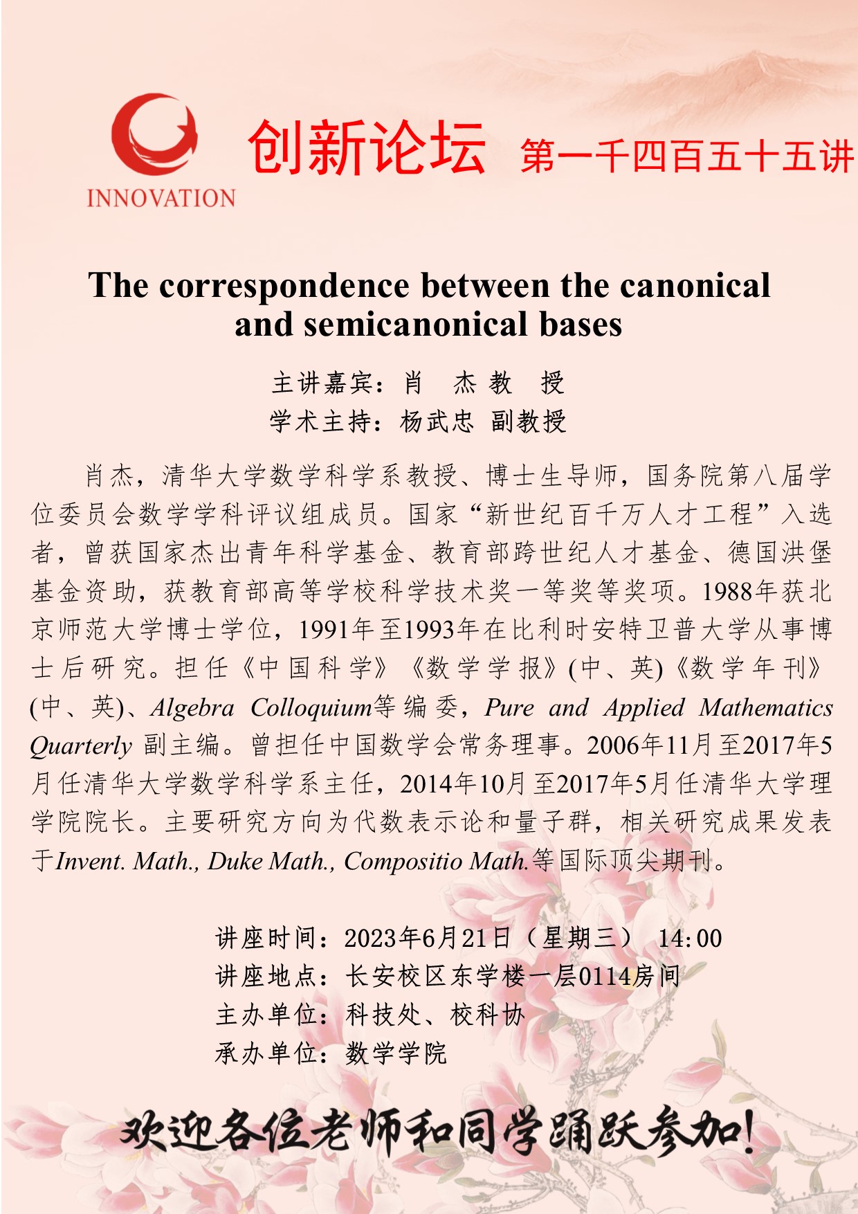 肖杰 教授 九游会在线登录官网创新论坛第一千四百五十五讲:The correspondence between the canonical and semicanonical bases 讲座时间 2023年6月21日(星期三) 14:00 讲座地点 长安校区东学楼一层0114房间 讲座人介绍 肖杰 教授 讲座内容