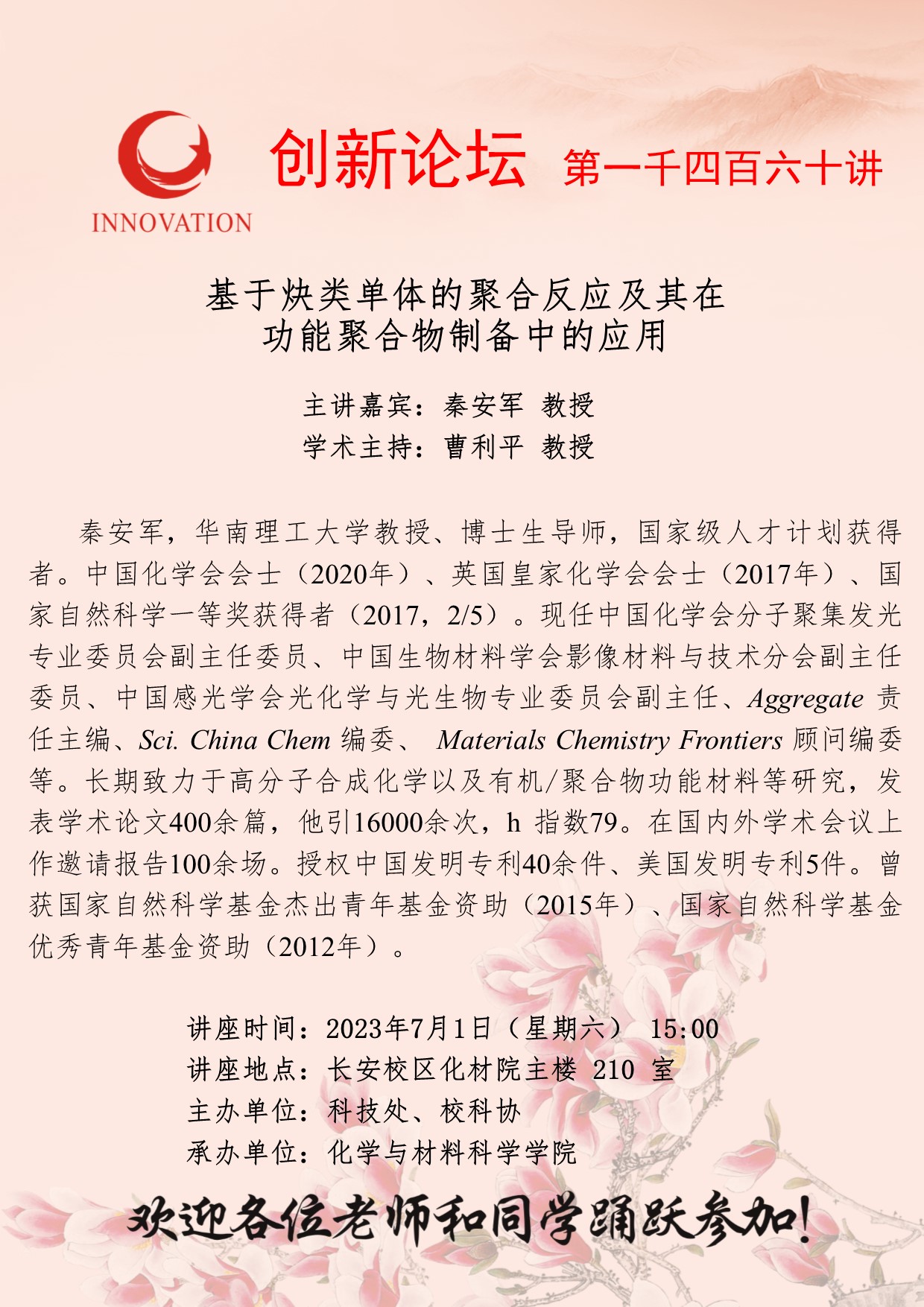 秦安军 教授 九游会在线登录官网创新论坛第一千四百六十讲:基于炔类单体的聚合反应及其在功能聚合物制备中的应用 讲座时间 2023年7月1日(星期六) 15:00 讲座地点 长安校区化材院主楼 210 室 讲座人介绍 秦安军 教授 讲座内容
