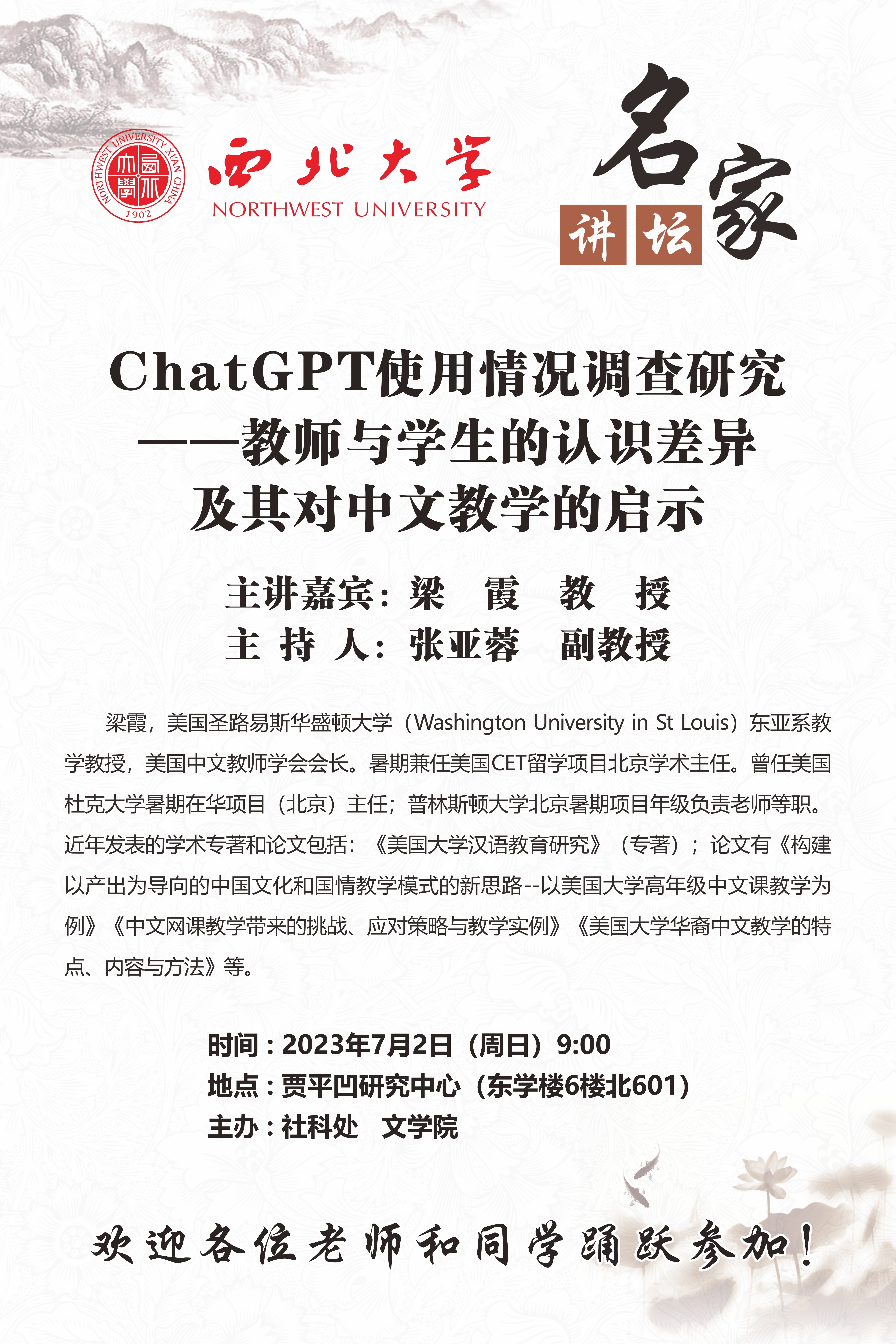 梁霞 教授 名家讲坛:ChatGPT使用情况调查研究 ——教师与学生的认识差异及其对中文教学的启示 讲座时间 2023年7月2日(周日)9:00 讲座地点 贾平凹研究中心 (东学楼6楼北601) 讲座人介绍 梁霞 教授 讲座内容