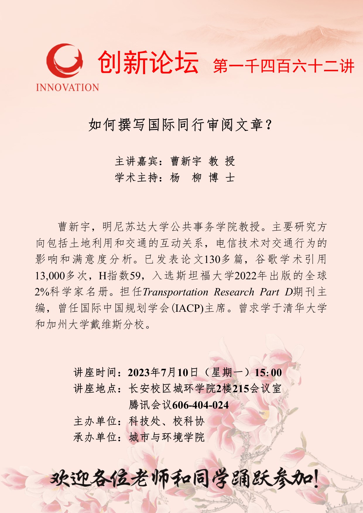 曹新宇 教授 九游会在线登录官网创新论坛第一千四百六十二讲:如何撰写国际同行审阅文章? 讲座时间 2023年7月10日(星期一)15:00 讲座地点 长安校区城环学院2楼215会议室 讲座人介绍 曹新宇 教授 讲座内容
