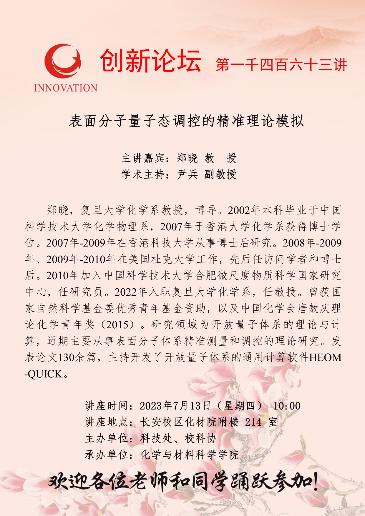 郑晓 教授 九游会在线登录官网创新论坛第一千四百六十三讲:表面分子量子态调控的精准理论模拟 讲座时间 023年7月13日(星期四) 10:00 讲座地点 长安校区化材院附楼214室 讲座人介绍 郑晓 教授 讲座内容
