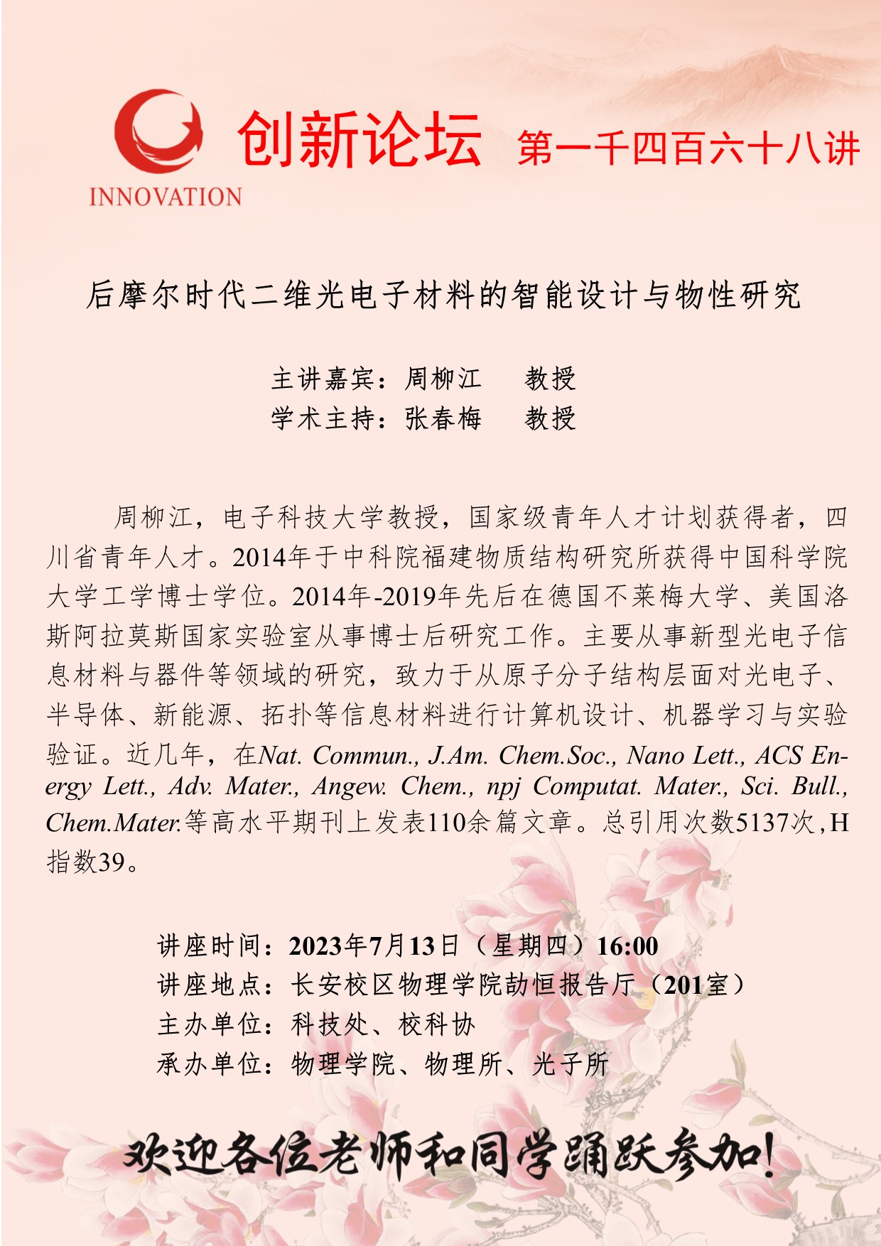 周柳江 教授 九游会在线登录官网创新论坛第一千四百六十八讲:后摩尔时代二维光电子材料的智能设计与物性研究 讲座时间 2023年7月13日(星期四)16:00 讲座地点 长安校区物理学院劼恒报告厅(201室) 讲座人介绍 周柳江 教授 讲座内容