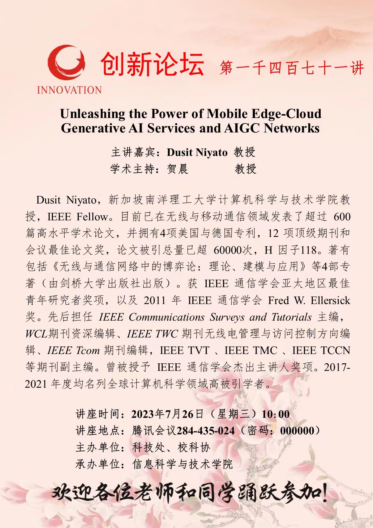 Dusit Niyato 教授 九游会在线登录官网创新论坛第一千四百七十一讲:Unleashing the Power of Mobile Edge-Cloud Generative AI Services and AIGC Networks 讲座时间 2023年7月26日(星期三)10:00 讲座地点 腾讯会议284-435-024(密码:000000) 讲座人介绍 Dusit Niyato 教授 讲座内容