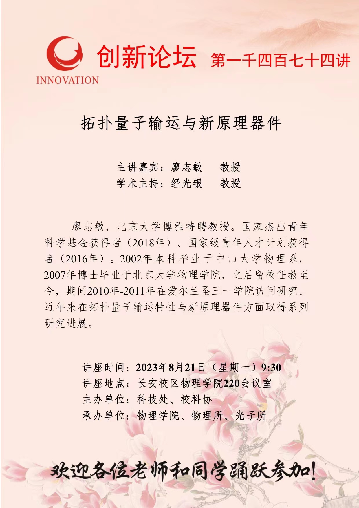 廖志敏 教授 九游会在线登录官网创新论坛第一千四百七十四讲:拓扑量子输运与新原理器件 讲座时间 2023年8月21日(星期一)9:30 讲座地点 长安校区物理学院220会议室 讲座人介绍 廖志敏 教授 讲座内容
