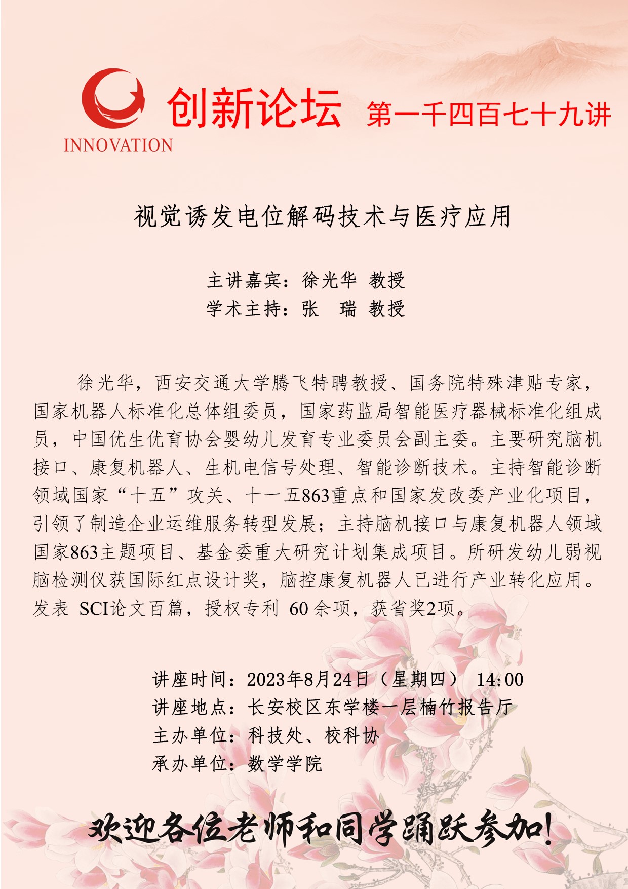 徐光华 教授 九游会在线登录官网创新论坛第一千四百七十九讲:视觉诱发电位解码技术与医疗应用 讲座时间 2023年8月24日(星期四) 14:00 讲座地点 长安校区东学楼一层楠竹报告厅 讲座人介绍 徐光华 教授 讲座内容