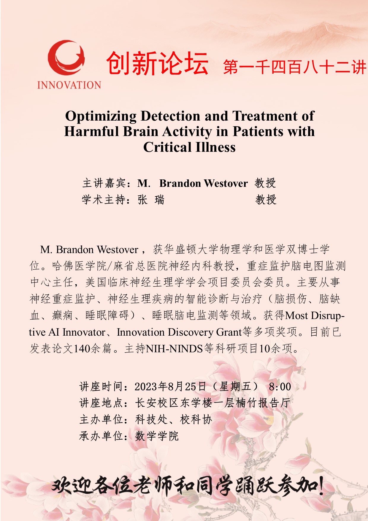 M. Brandon Westover 教授 九游会在线登录官网创新论坛第一千四百八十二讲:Optimizing Detection and Treatment of Harmful Brain Activity in Patients with Critical Illness 讲座时间 2023年8月25日(星期五) 8:00 讲座地点 长安校区东学楼一层楠竹报告厅 讲座人介绍 M. Brandon Westover 教授 讲座内容