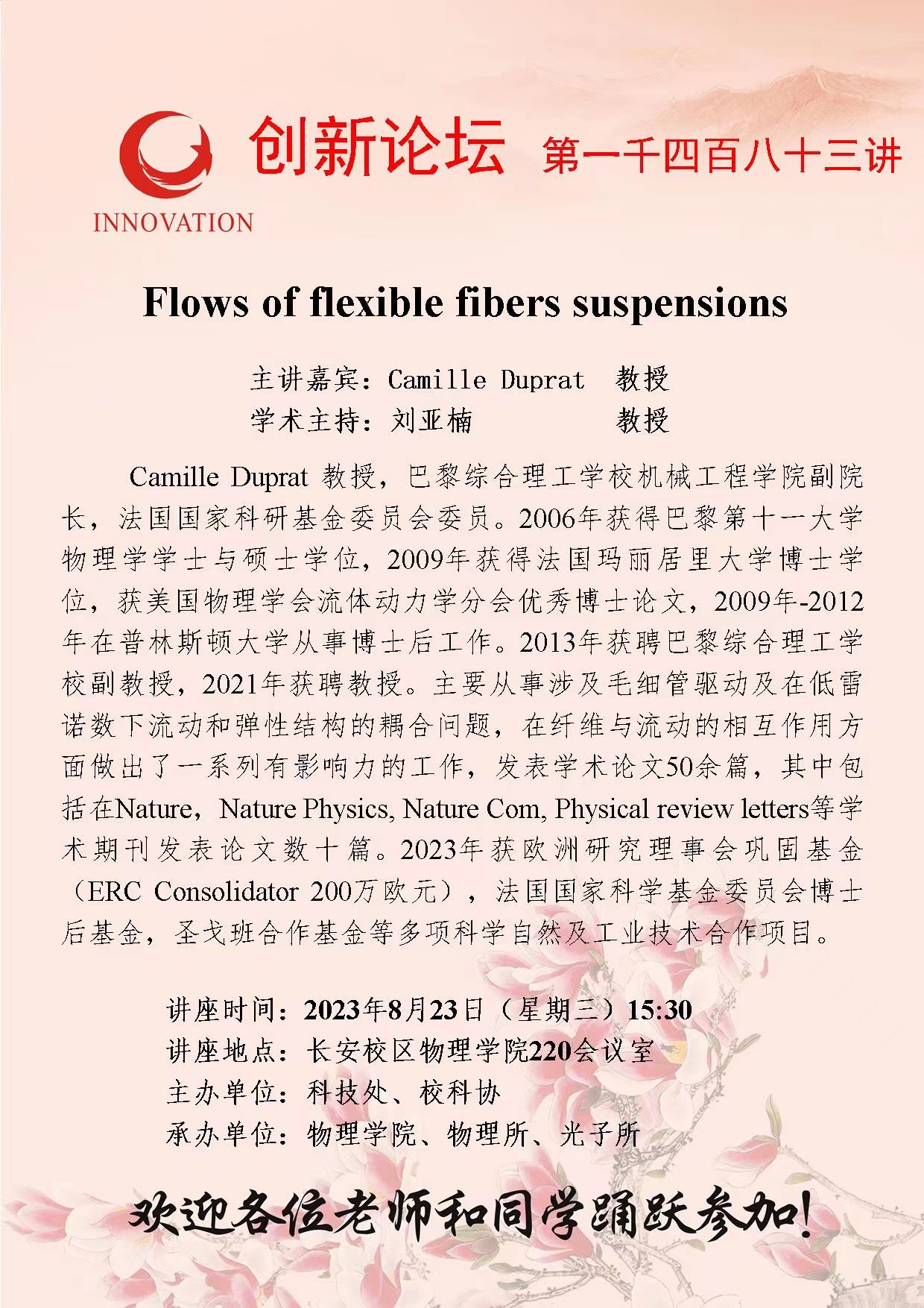 Camille Duprat 教授 九游会在线登录官网创新论坛第一千四百八十三讲:Flows of flexible fibers suspensions 讲座时间 2023年8月23日(星期三) 15:30 讲座地点 长安校区物理学院220会议室 讲座人介绍 Camille Duprat 教授 讲座内容