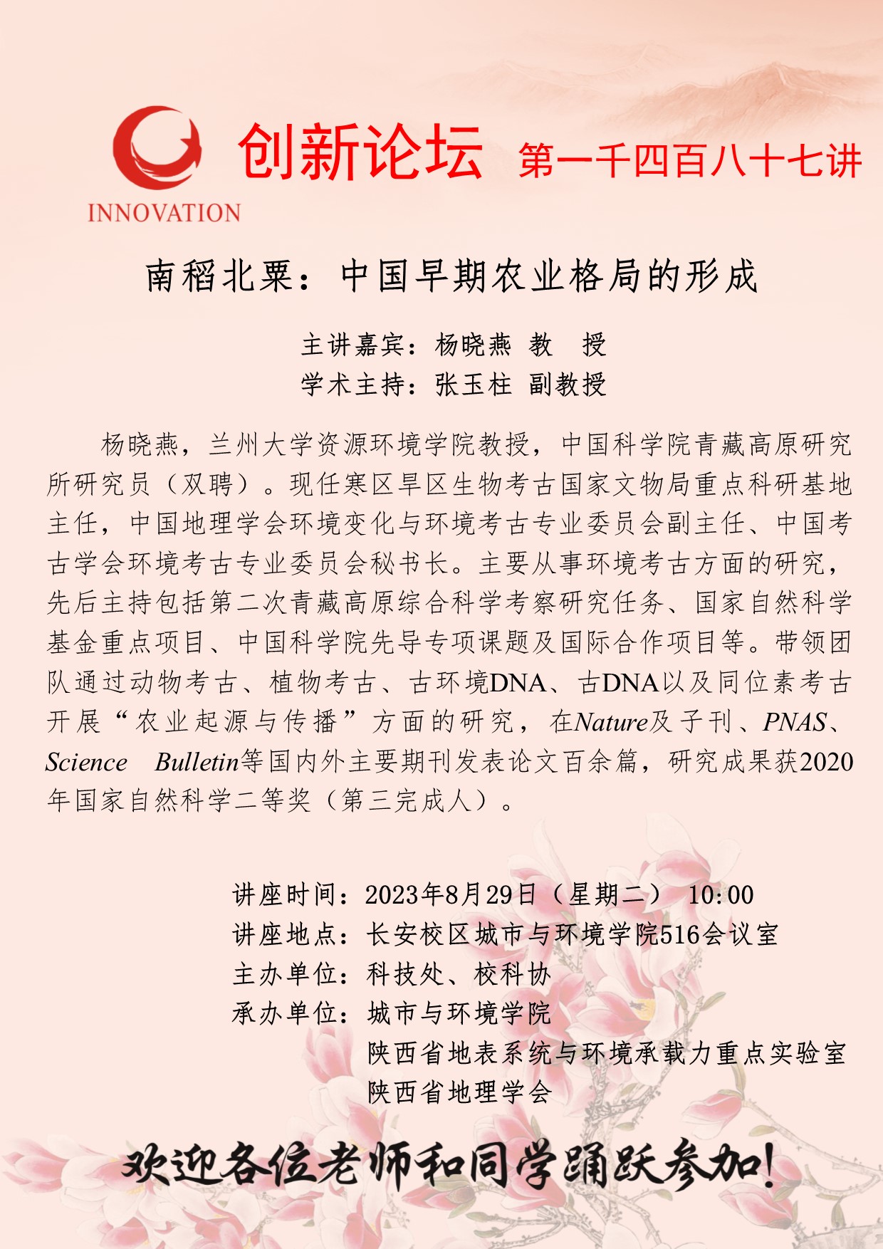 杨晓燕 教授 九游会在线登录官网创新论坛第一千四百八十七讲:南稻北粟:中国早期农业格局的形成 讲座时间 2023年8月29日(星期二) 10:00 讲座地点 长安校区城市与环境学院516会议室 讲座人介绍 杨晓燕 教授 讲座内容