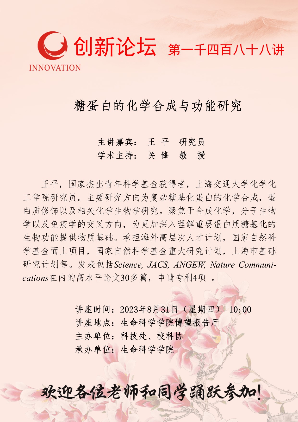 王平 研究员 九游会在线登录官网创新论坛第一千四百八十八讲:糖蛋白的化学合成与功能研究 讲座时间 2023年8月31日(星期四) 10:00 讲座地点 生命科学学院博望报告厅 讲座人介绍 王平 研究员 讲座内容