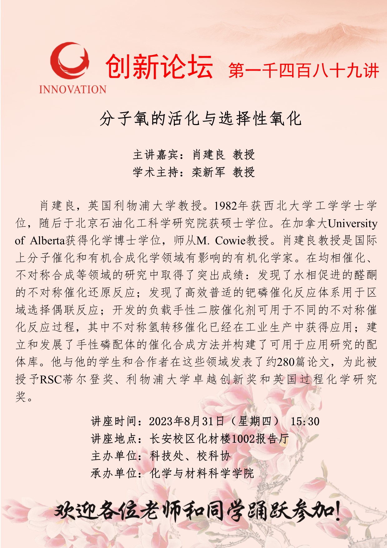 肖建良 教授 九游会在线登录官网创新论坛第一千四百八十九讲:分子氧的活化与选择性氧化 讲座时间 2023年8月31日(星期四) 15:30 讲座地点 长安校区化材楼1002报告厅 讲座人介绍 肖建良 教授 讲座内容
