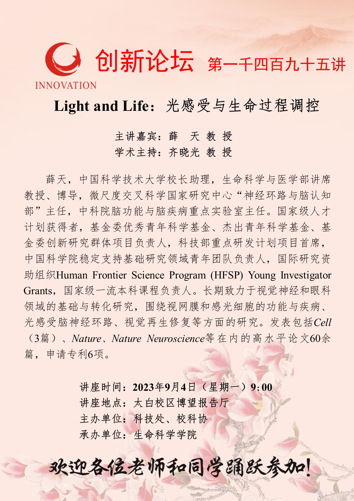 薛天 教授 九游会在线登录官网创新论坛第一千四百九十五讲:Light and Life:光感受与生命过程调控 讲座时间 2023年9月4日(星期一)9:00 讲座地点 太白校区博望报告厅 讲座人介绍 薛天 教授 讲座内容