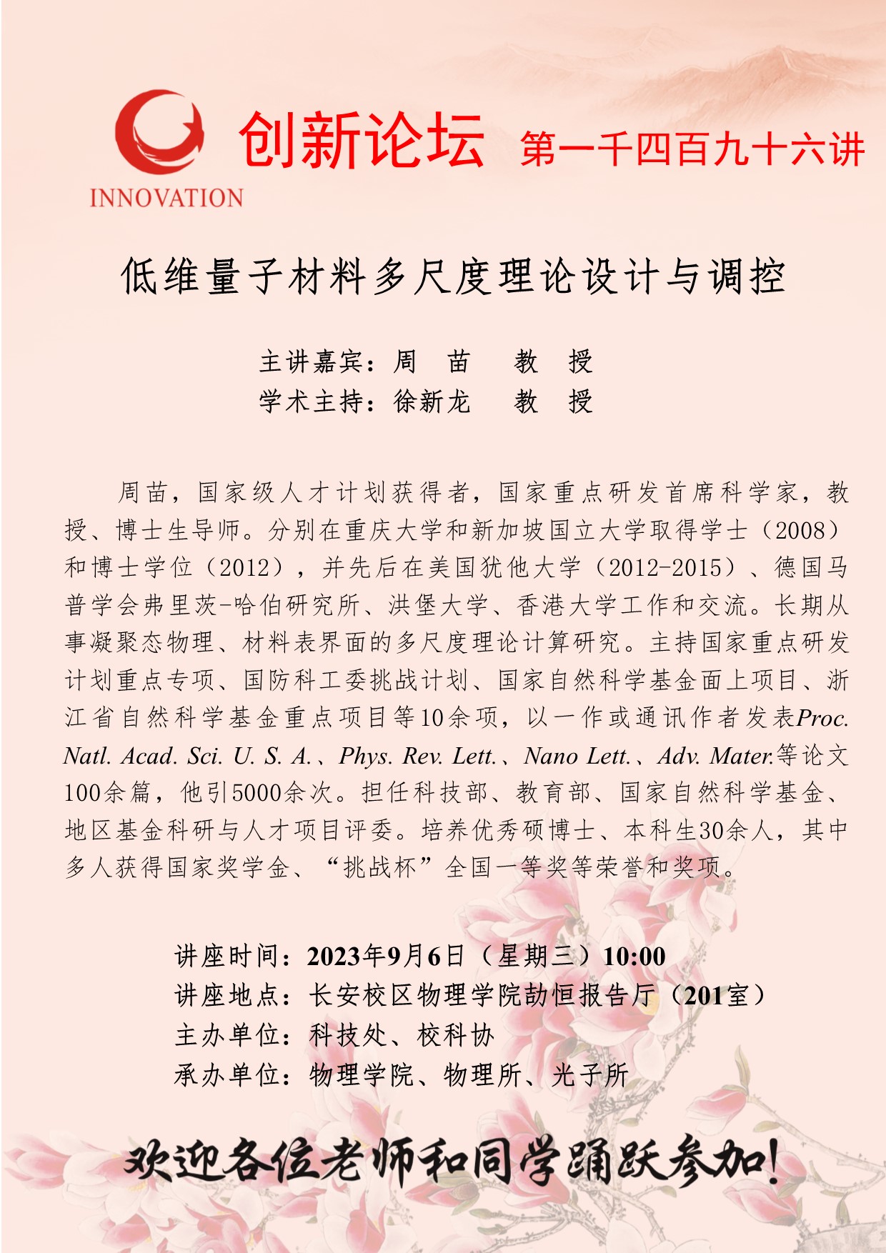 周苗 教授 九游会在线登录官网创新论坛第一千四百九十六讲:低维量子材料多尺度理论设计与调控 讲座时间 2023年9月6日(星期三)10:00 讲座地点 长安校区物理学院劼恒报告厅(201室) 讲座人介绍 周苗 教授 讲座内容