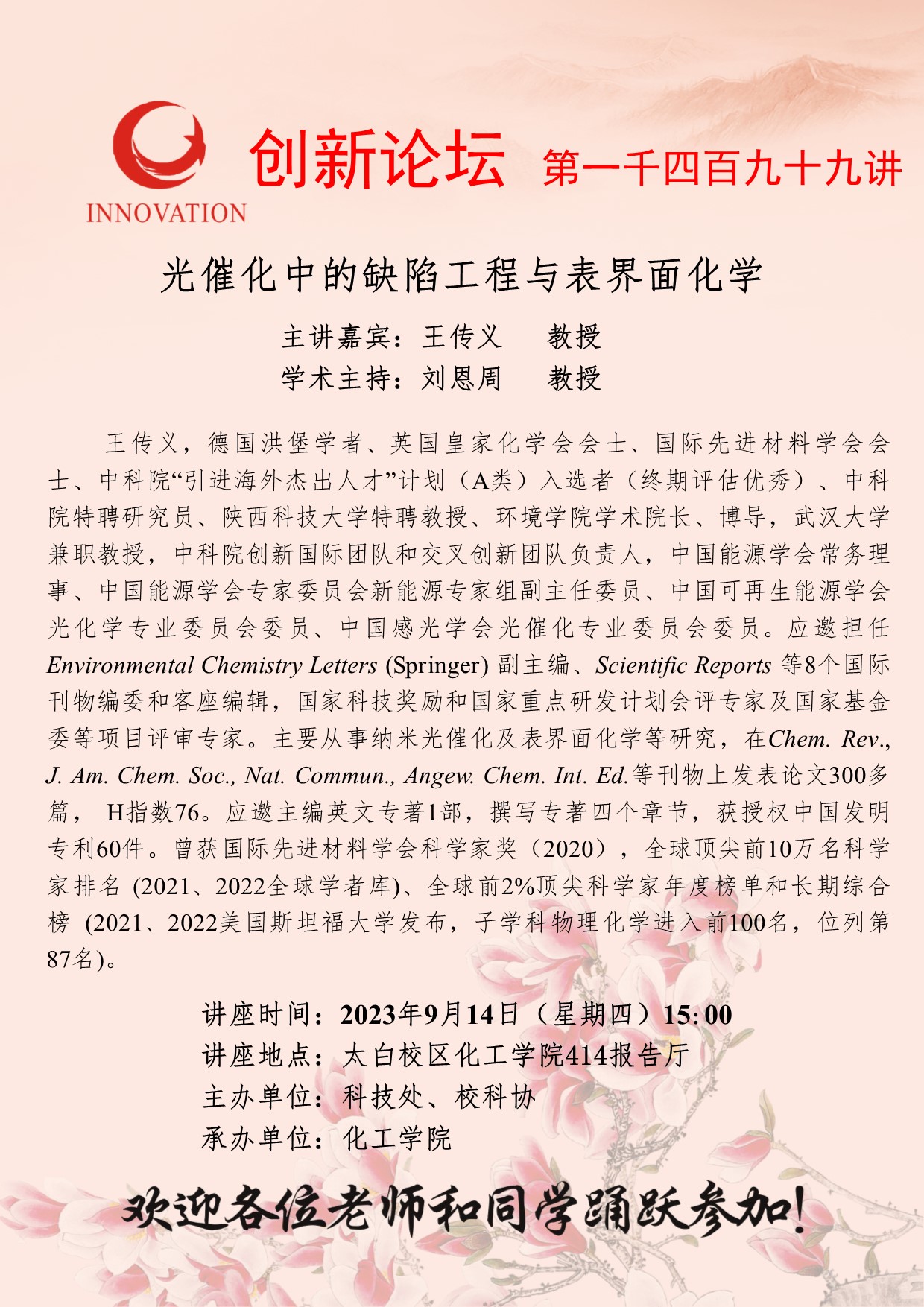 王传义 教授 九游会在线登录官网创新论坛第一千四百九十九讲:光催化中的缺陷工程与表界面化学 讲座时间 2023年9月14日(星期四)15:00 讲座地点 太白校区化工学院414报告厅 讲座人介绍 王传义 教授 讲座内容