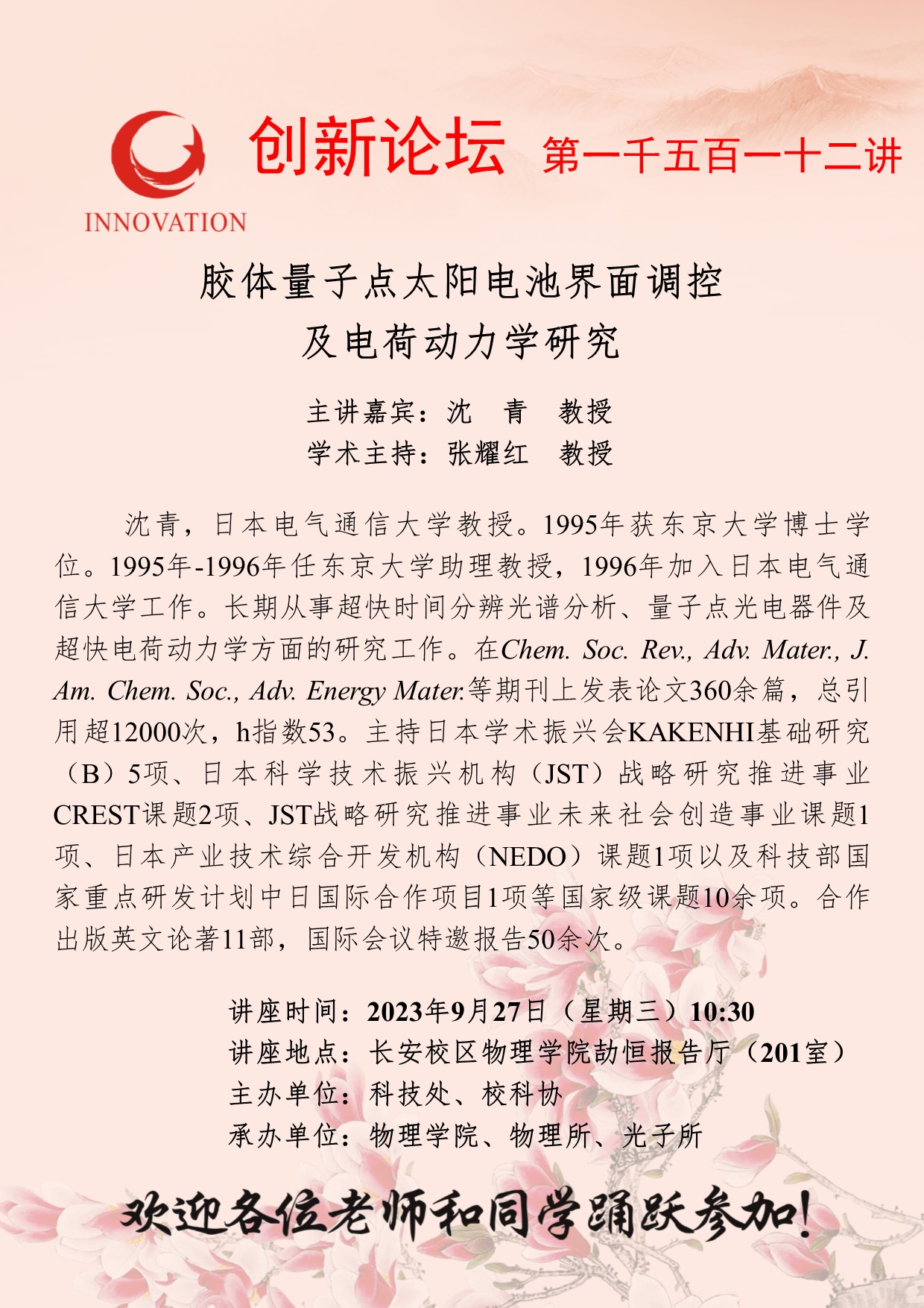 沈青 教授 九游会在线登录官网创新论坛第一千五百一十二讲:胶体量子点太阳电池界面调控及电荷动力学研究 讲座时间 2023年9月27日(星期三)10:30 讲座地点 长安校区物理学院劼恒报告厅(201室) 讲座人介绍 沈青 教授 讲座内容