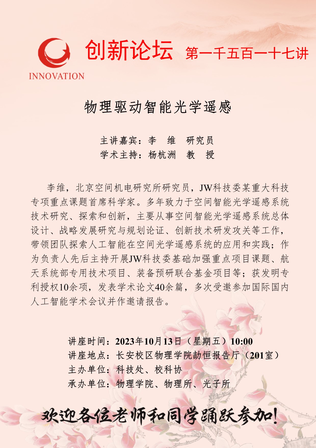 李维 研究员 九游会在线登录官网创新论坛第一千五百一十七讲:物理驱动智能光学遥感 讲座时间 2023年10月13日(星期五)10:00 讲座地点 长安校区物理学院劼恒报告厅(201室) 讲座人介绍 李维 研究员 讲座内容