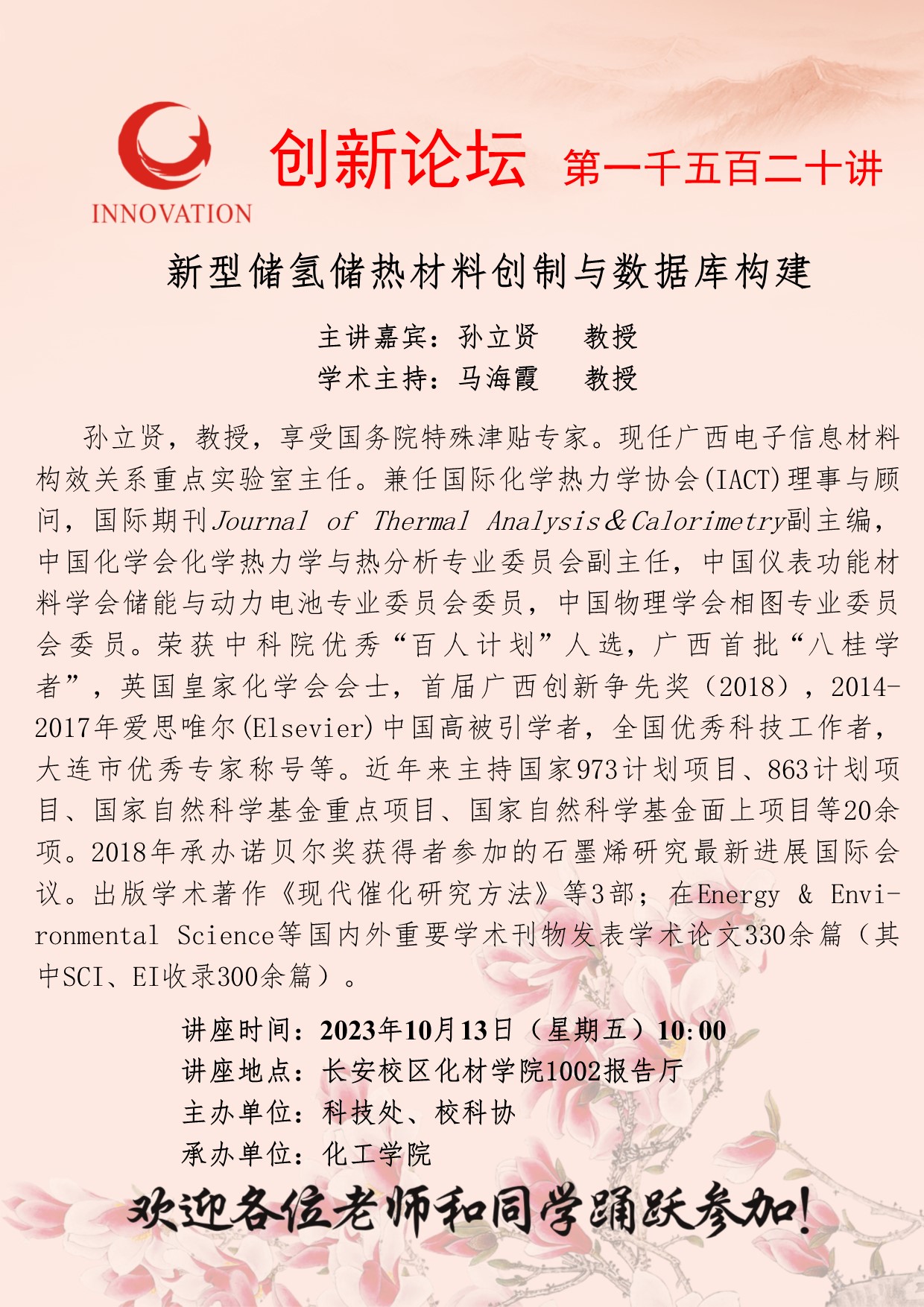 孙立贤 教授 九游会在线登录官网创新论坛第一千五百二十讲:新型储氢储热材料创制与数据库构建 讲座时间 2023年10月13日(星期五)10:00 讲座地点 长安校区化材学院1002报告厅 讲座人介绍 孙立贤 教授 讲座内容