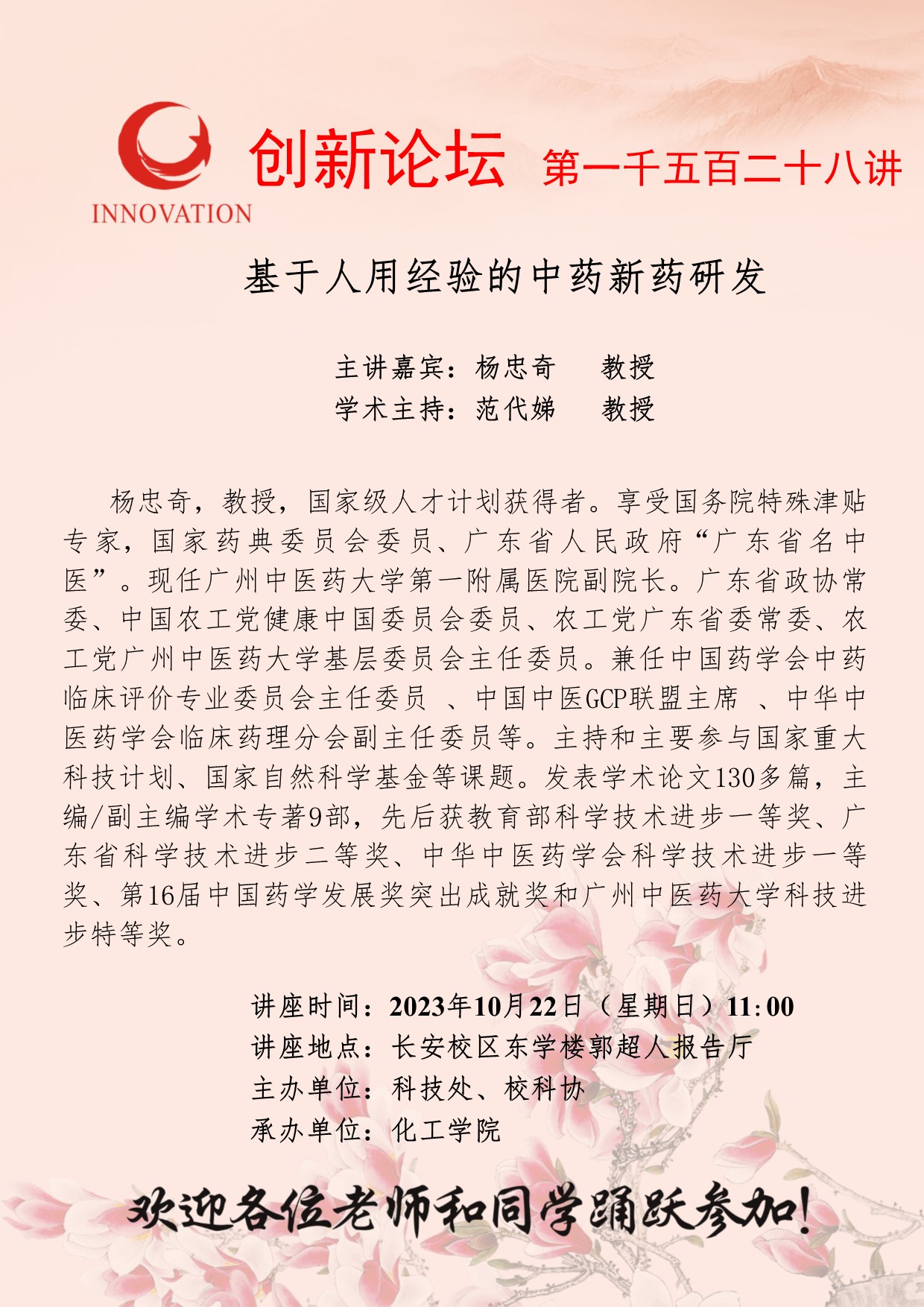 杨忠奇 教授 九游会在线登录官网创新论坛第一千五百二十八讲:基于人用经验的中药新药研发 讲座时间 2023年10月22日(星期日)11:00 讲座地点 长安校区东学楼郭超人报告厅 讲座人介绍 杨忠奇 教授 讲座内容