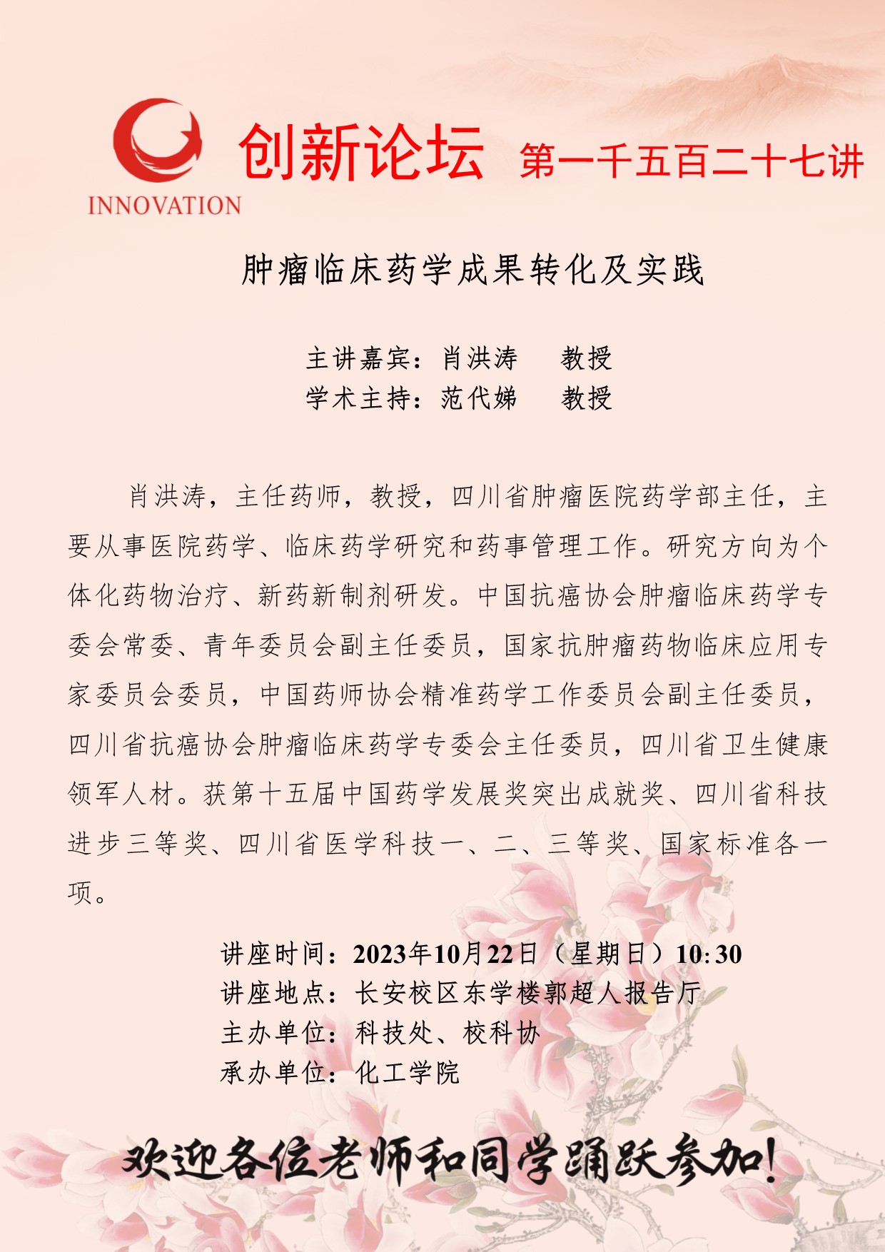 肖洪涛 教授 九游会在线登录官网创新论坛第一千五百二十七讲:肿瘤临床药学成果转化及实践 讲座时间 2023年10月22日(星期日)10:30 讲座地点 长安校区东学楼郭超人报告厅 讲座人介绍 肖洪涛 教授 讲座内容