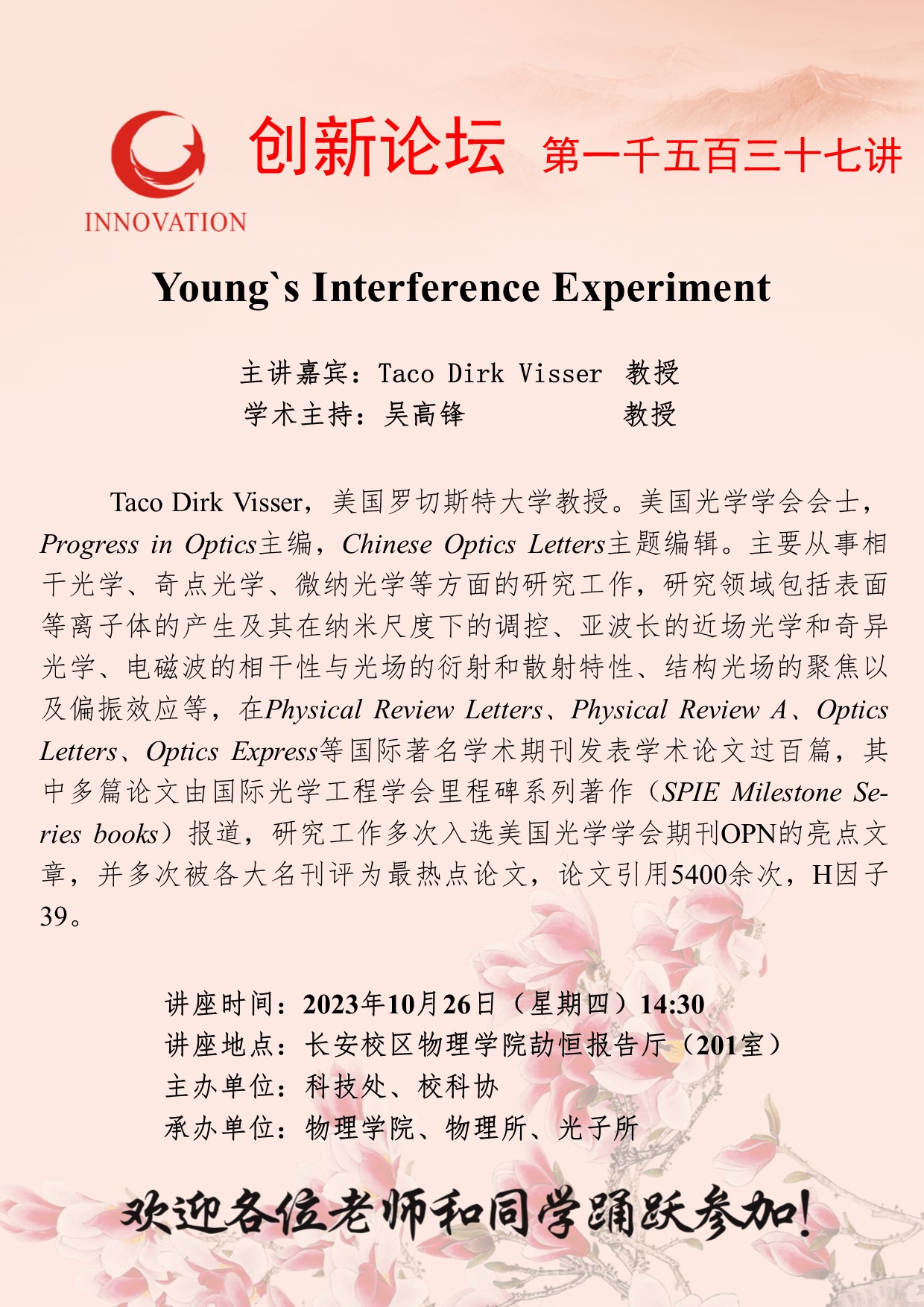 Taco Dirk Visser 教授 九游会在线登录官网创新论坛第一千五百三十七讲:Young`s Interference Experiment 讲座时间 2023年10月26日(星期四)14:30 讲座地点 长安校区物理学院劼恒报告厅(201室) 讲座人介绍 Taco Dirk Visser 教授 讲座内容