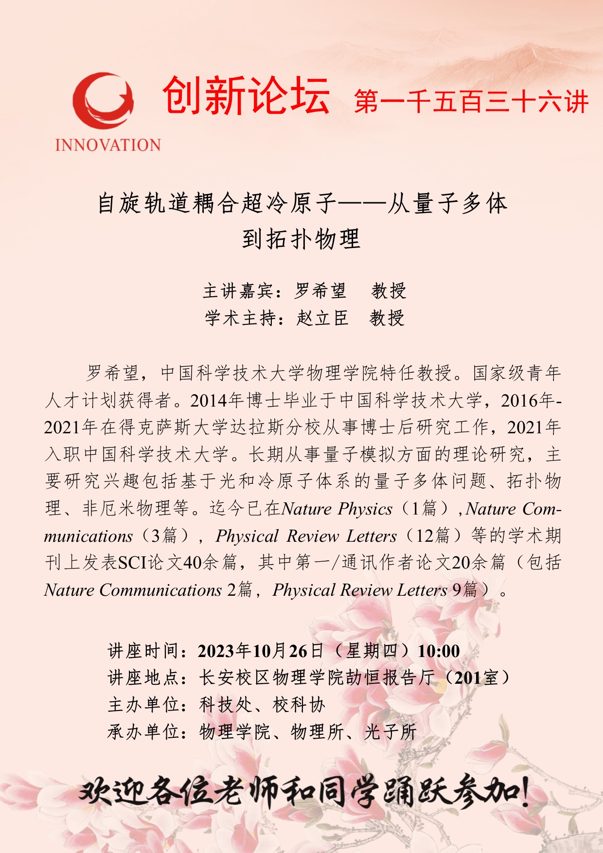 罗希望 教授 九游会在线登录官网创新论坛第一千五百三十六讲:自旋轨道耦合超冷原子——从量子多体到拓扑物理 讲座时间 2023年10月26日(星期四)10:00 讲座地点 长安校区物理学院劼恒报告厅(201室) 讲座人介绍 罗希望 教授 讲座内容