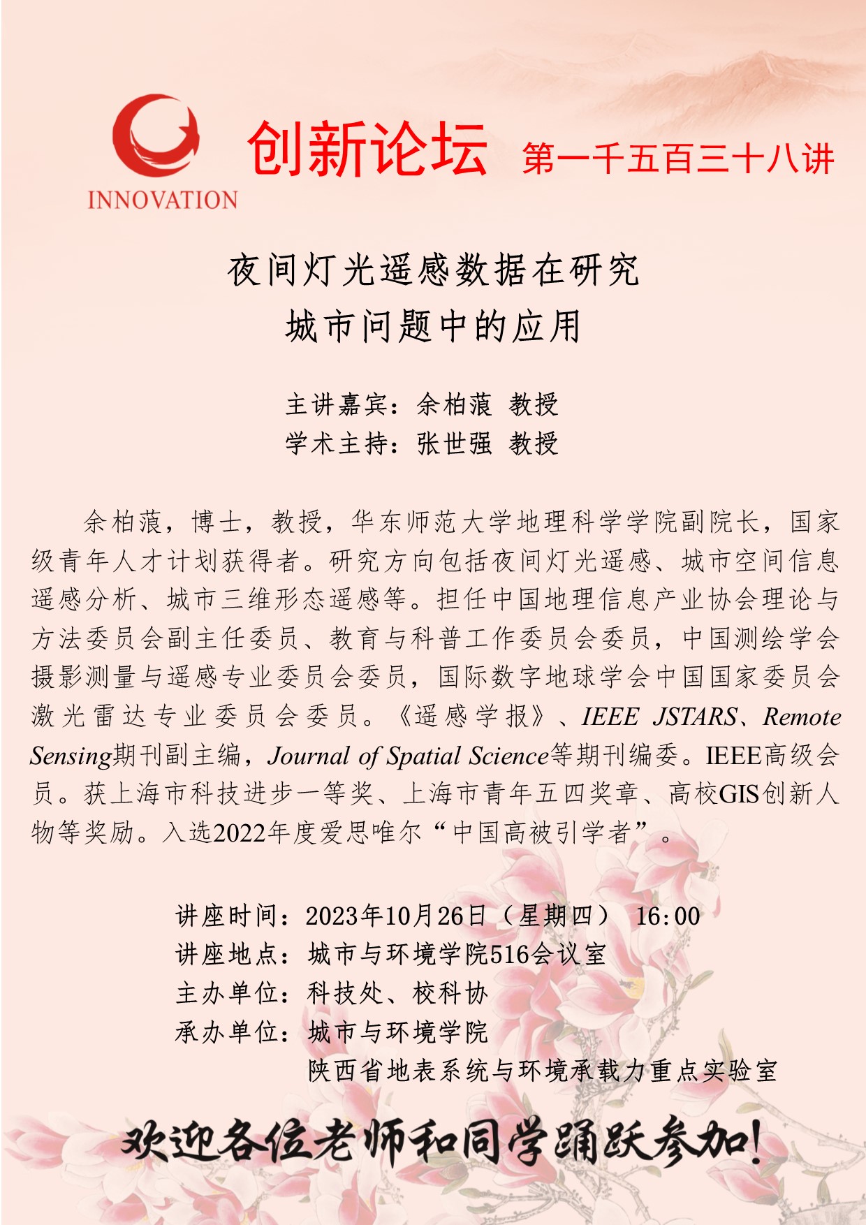 余柏蒗 教授 九游会在线登录官网创新论坛第一千五百三十八讲:夜间灯光遥感数据在研究城市问题中的应用 讲座时间 2023年10月26日(星期四) 16:00 讲座地点 城市与环境学院516会议室 讲座人介绍 余柏蒗 教授 讲座内容