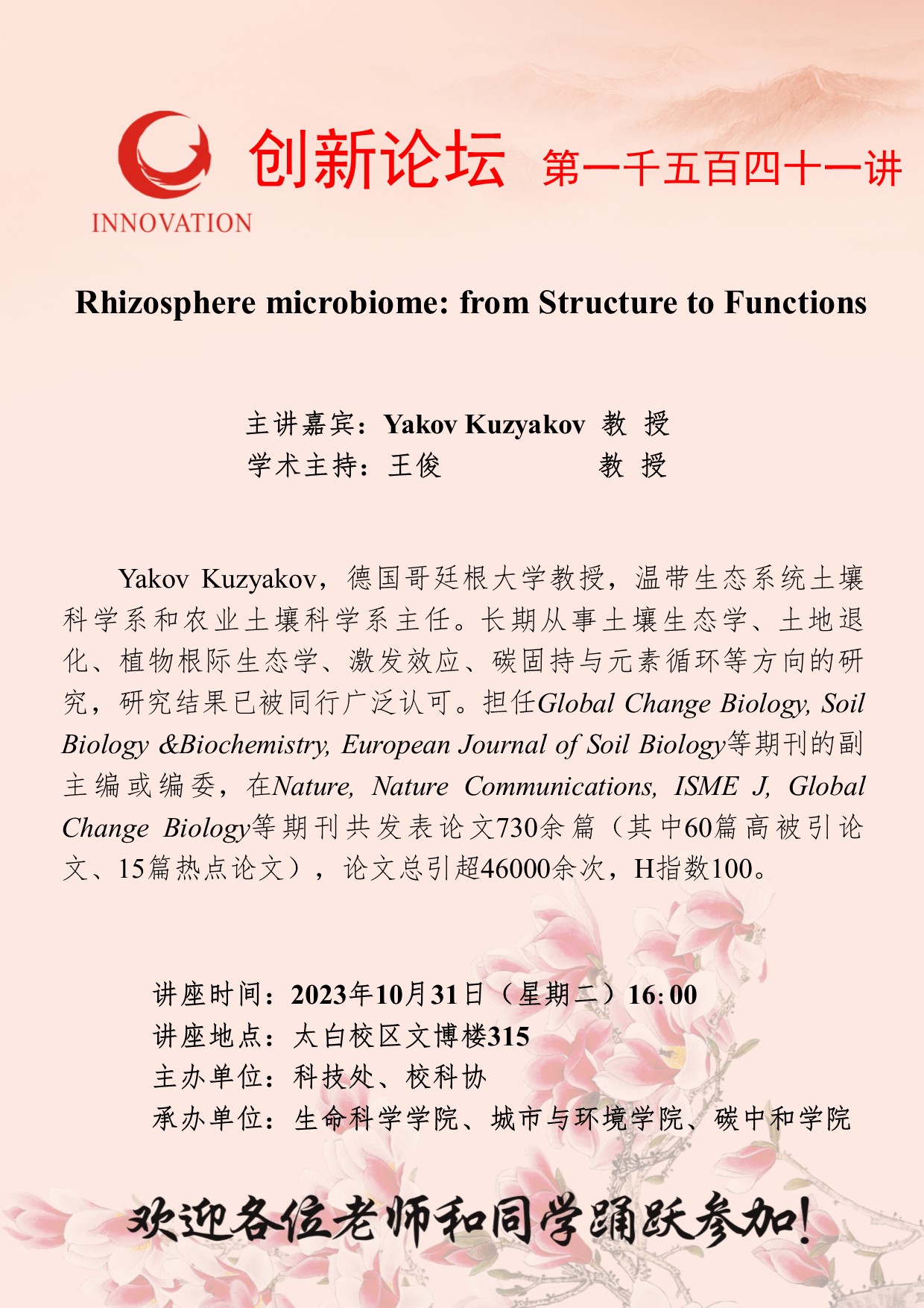 Yakov Kuzyakov 教 授 九游会在线登录官网创新论坛第一千五百四十一讲:Rhizosphere microbiome: from Structure to Functions 讲座时间 2023年10月31日(星期二)16:00 讲座地点 太白校区文博楼315 讲座人介绍 Yakov Kuzyakov 教 授 讲座内容