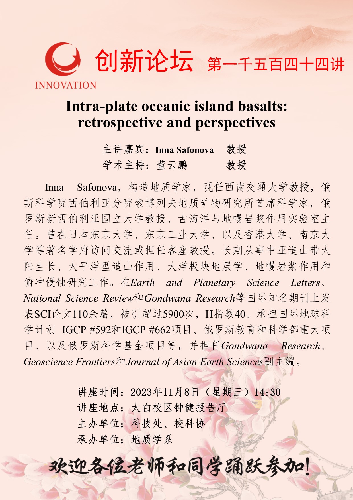 Inna Safonova 教授 九游会在线登录官网创新论坛第一千五百四十四讲:Intra-plate oceanic island basalts: retrospective and perspectives 讲座时间 2023年11月8日(星期三)14:30 讲座地点 太白校区钟健报告厅 讲座人介绍 Inna Safonova 教授 讲座内容