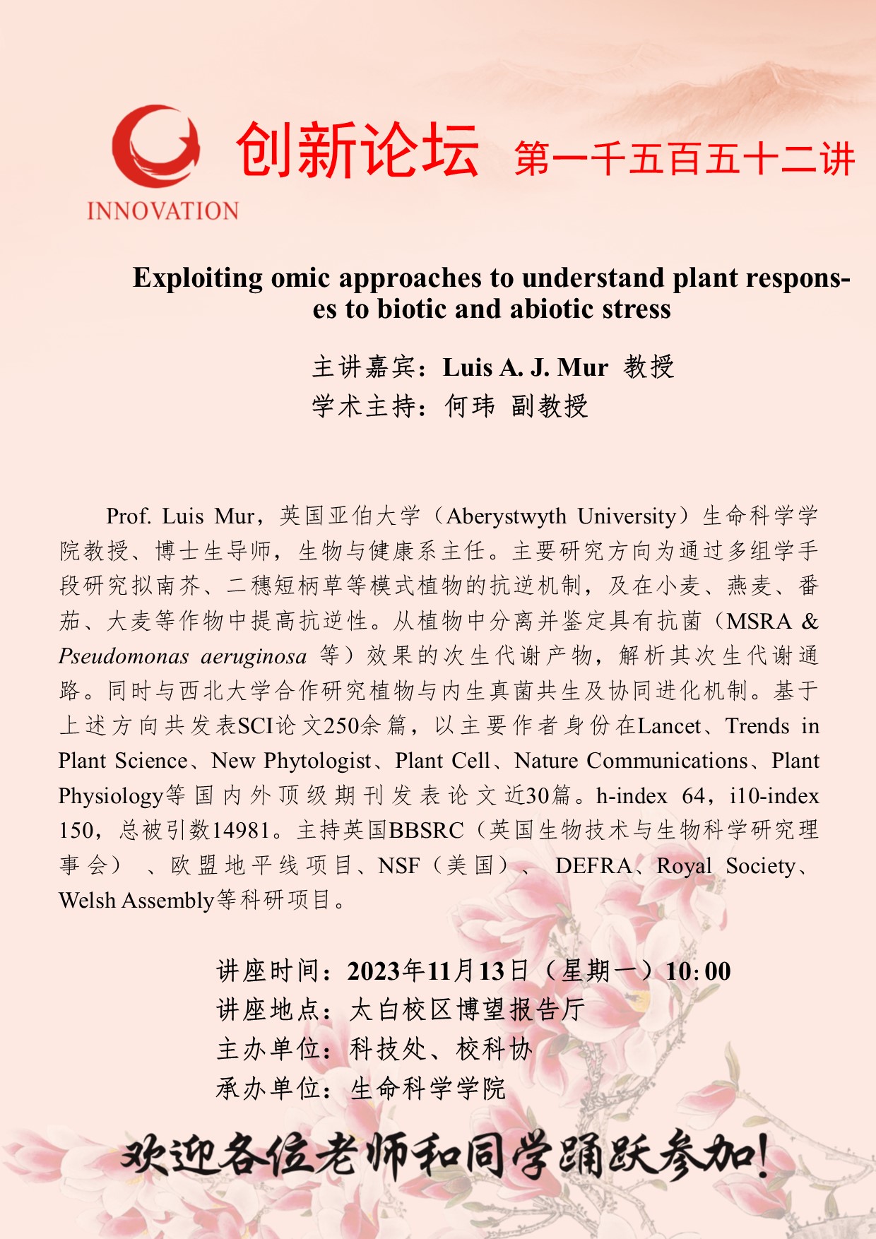 Luis A. J. Mur 教授 九游会在线登录官网创新论坛第一千五百五十二讲:Exploiting omic approaches to understand plant responses to biotic and abiotic stress 讲座时间 2023年11月13日(星期一)10:00 讲座地点 太白校区博望报告厅 讲座人介绍 Luis A. J. Mur 教授 讲座内容