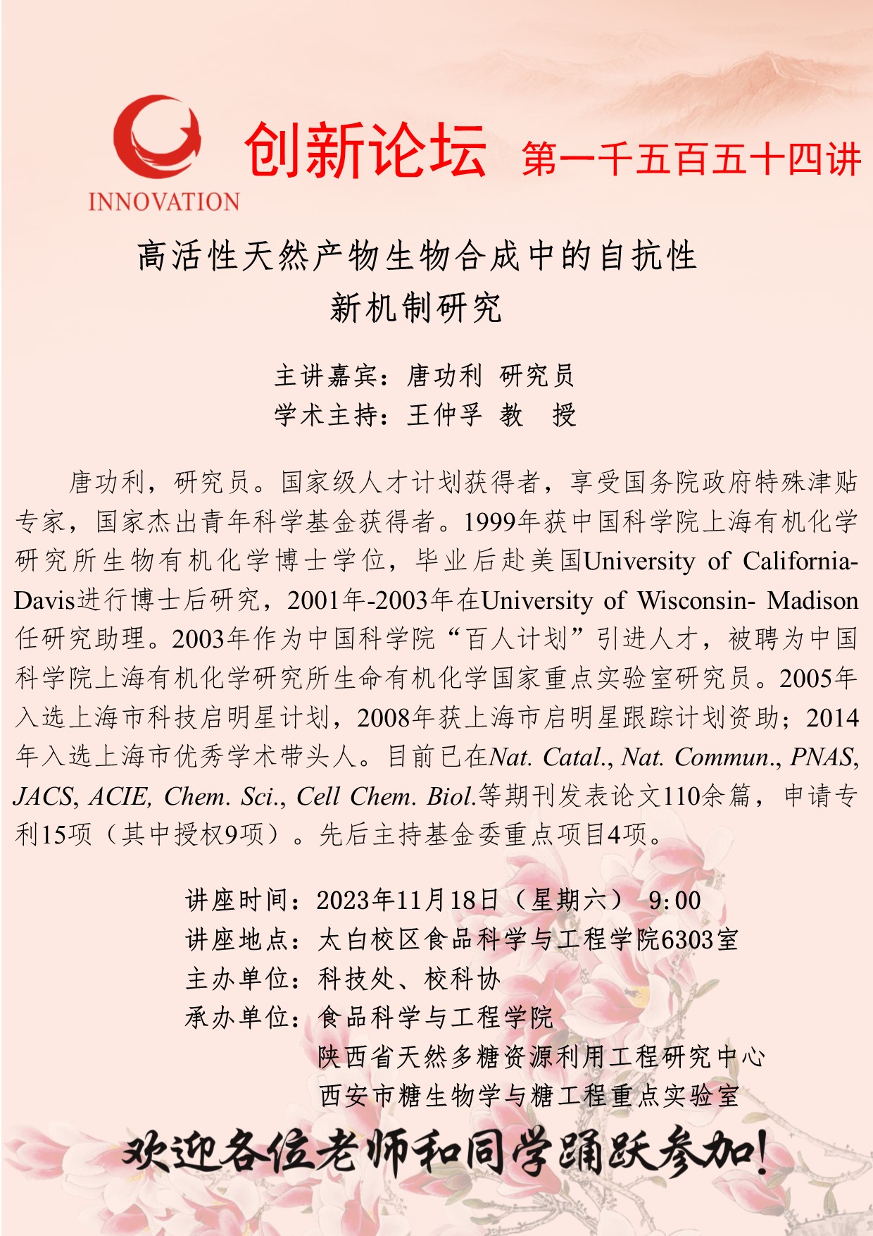 唐功利 研究员 九游会在线登录官网创新论坛第一千五百五十四讲:高活性天然产物生物合成中的自抗性 新机制研究 讲座时间 2023年11月18日(星期六) 9:00 讲座地点 太白校区食品科学与工程学院6303室 讲座人介绍 唐功利 研究员 讲座内容