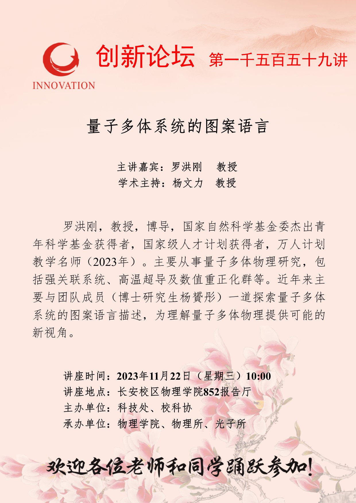 罗洪刚 教授 九游会在线登录官网创新论坛第一千五百五十九讲:量子多体系统的图案语言 讲座时间 2023年11月22日(星期三)10:00 讲座地点 长安校区物理学院852报告厅 讲座人介绍 罗洪刚 教授 讲座内容