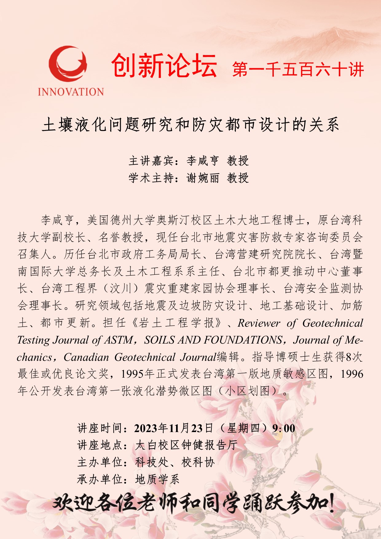 李咸亨 教授 九游会在线登录官网创新论坛第一千五百六十讲:土壤液化问题研究和防灾都市设计的关系 讲座时间 2023年11月23日(星期四)9:00 讲座地点 太白校区钟健报告厅 讲座人介绍 李咸亨 教授 讲座内容