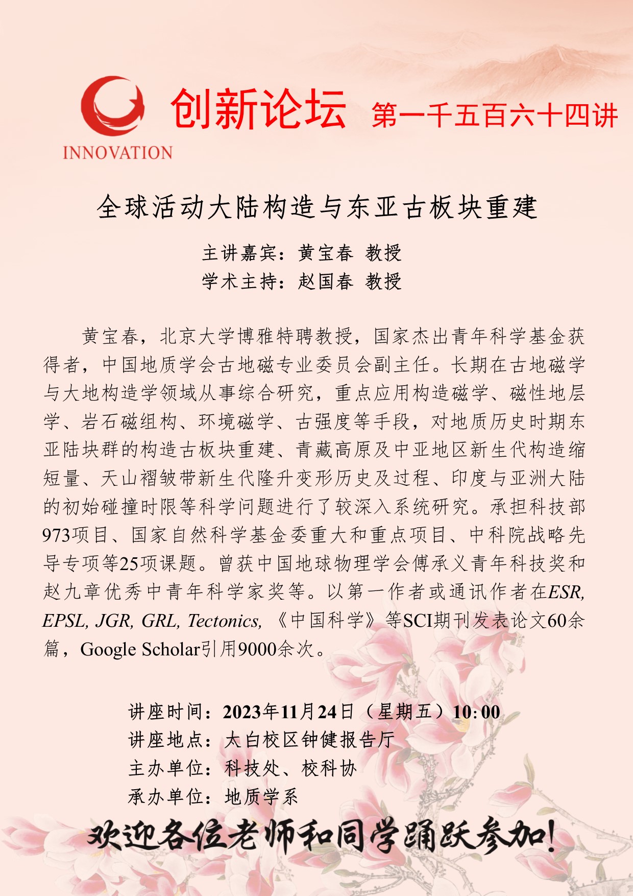 黄宝春 教授 九游会在线登录官网创新论坛第一千五百六十四讲:全球活动大陆构造与东亚古板块重建 讲座时间 2023年11月24日(星期五)10:00 讲座地点 太白校区钟健报告厅 讲座人介绍 黄宝春 教授 讲座内容