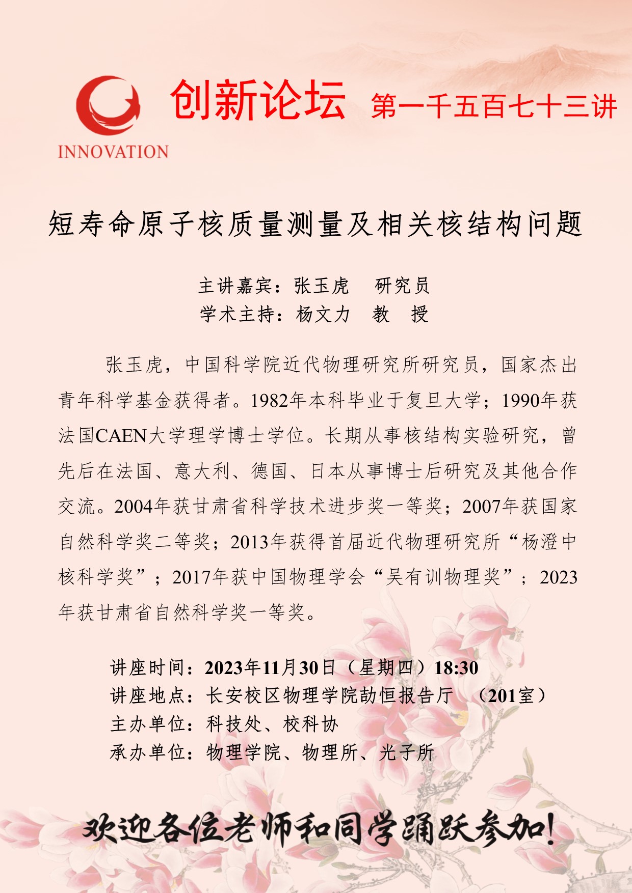 张玉虎 研究员 九游会在线登录官网创新论坛第一千五百七十三讲:短寿命原子核质量测量及相关核结构问题 讲座时间 2023年11月30日(星期四)18:30 讲座地点 长安校区物理学院劼恒报告厅 (201室) 讲座人介绍 张玉虎 研究员 讲座内容