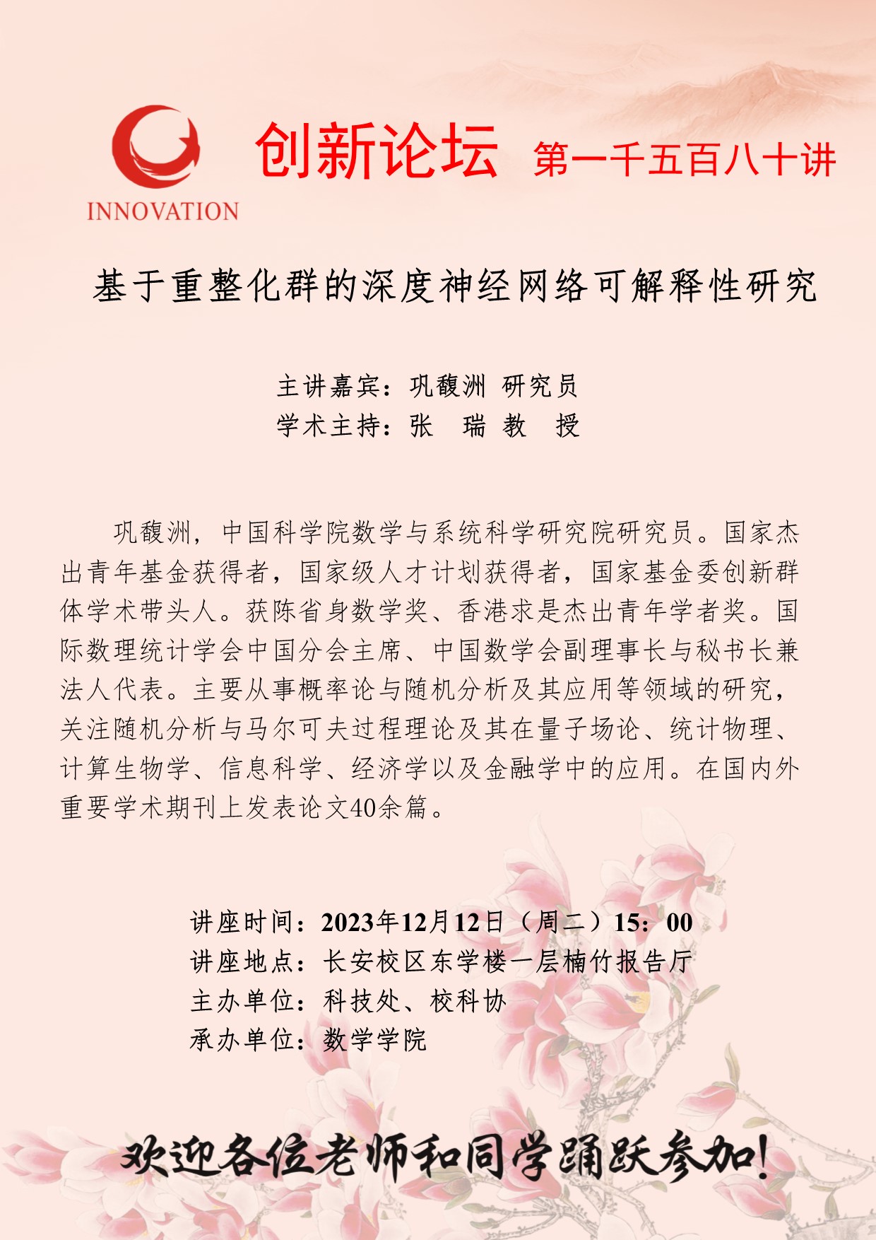巩馥洲 研究员 九游会在线登录官网创新论坛第一千五百八十讲:基于重整化群的深度神经网络可解释性研究 讲座时间 2023年12月12日(周二)15:00 讲座地点 长安校区东学楼一层楠竹报告厅 讲座人介绍 巩馥洲 研究员 讲座内容